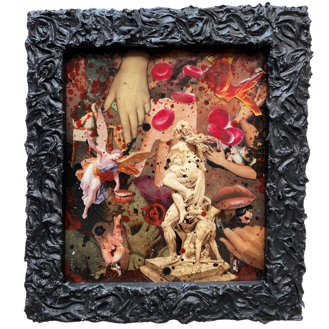 He is a versatile artist who immerses himself in a range of experimental practices, often employing resin in his paintings, mixed-media collages, and sculptures to capture the essence of disorder in the contemporary world. His artworks frequently carry allegorical or symbolic elements, with subjects like the archetypal human, conveying an urgent message that addresses biopolitical themes, illustrating how state authority and influence shape our physicality, thoughts, and existence.