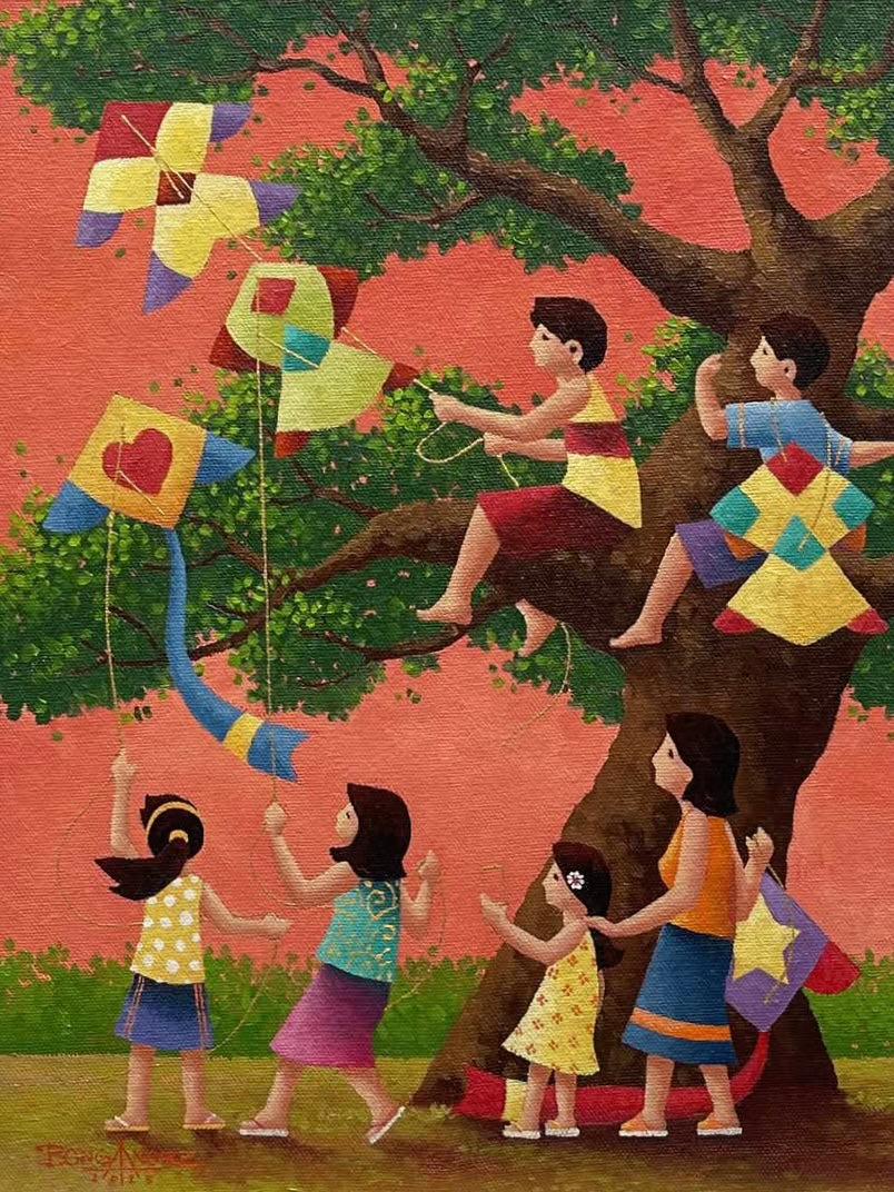 His painting is characterized by inanimate subjects of children both young and mature displaying and parading different sizes,  shapes, forms colors, design and angles as well as the heights of kite flight in bold choice of colors, thereby creating a brilliant and bright effect in an effort to boost and awaken our mood and sense to a joyous and ecstatic jubilation of what kite and its flight was all about. He belleve that art such as these are meant to cure the lonely and inspire us to a positive and optimistic look in life and in its pursuit to achieve the unobtainable and obtain what is unachievable.