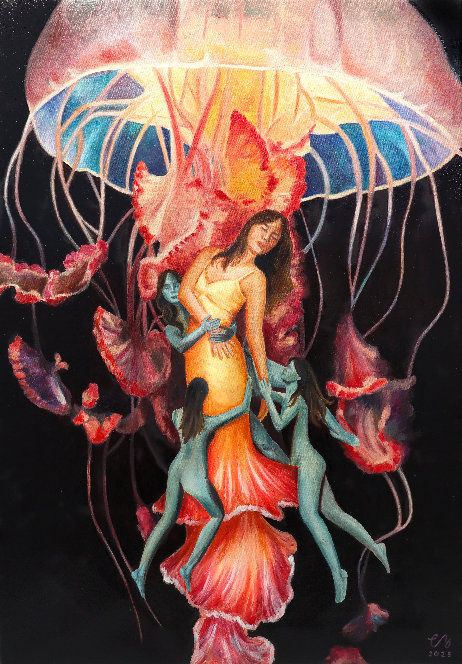 The jellyfish became a guide. Fluid and resilient, they symbolize growth, adaptability, and the quiet courage it takes to flow with life instead of resisting it. In their drifting form, I saw both softness and strength, the ability to move without losing oneself.