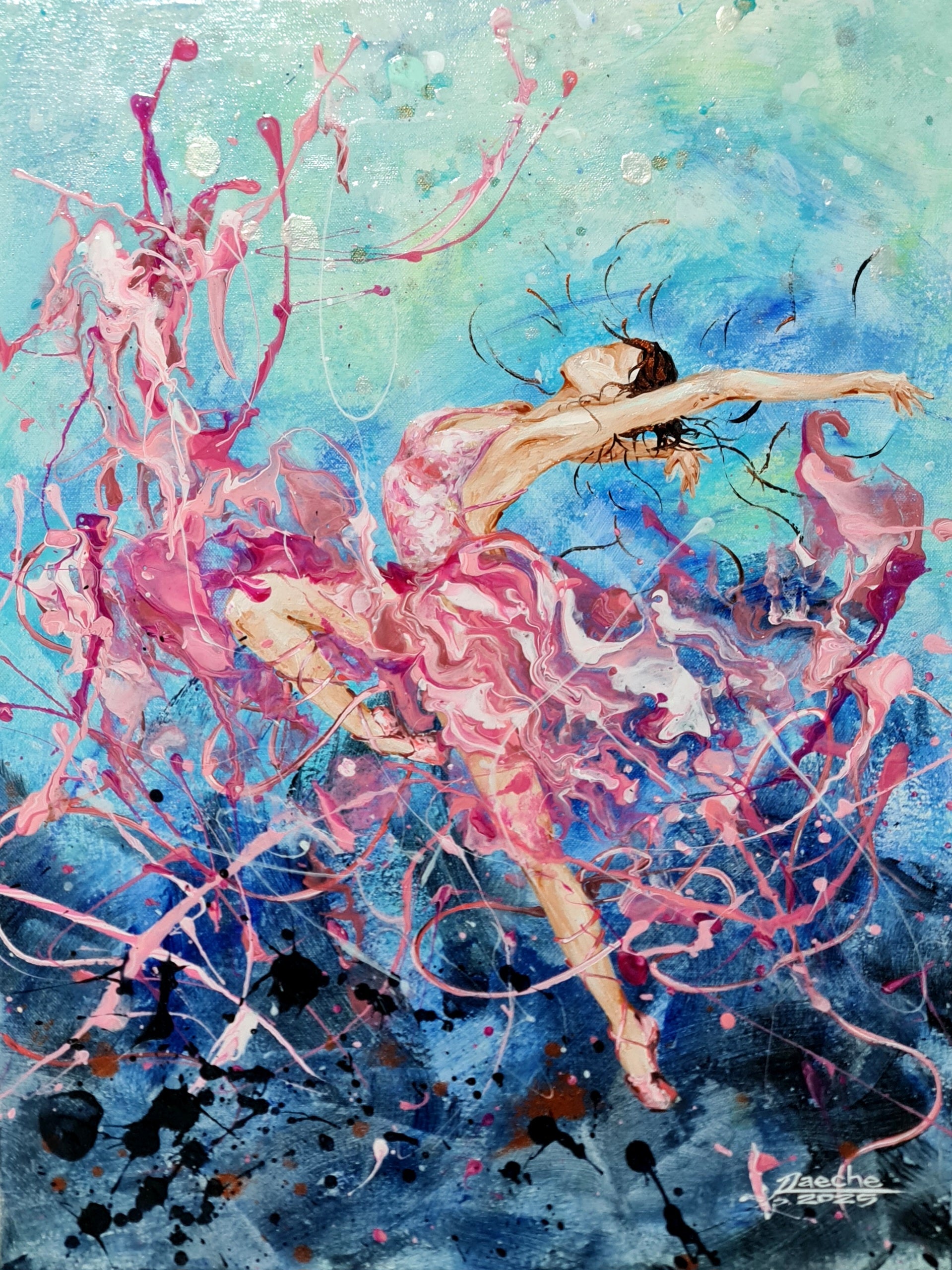 Expressions in movement. The artist paints as to where her colors lead her. Rich and bright tones – blues, purples – with a fluid style that captures the essence of her subject through the motions it possesses. Diverse poses, raw and spontaneous, that depict the fleeting nature of an expression, be it elemental or emotional.