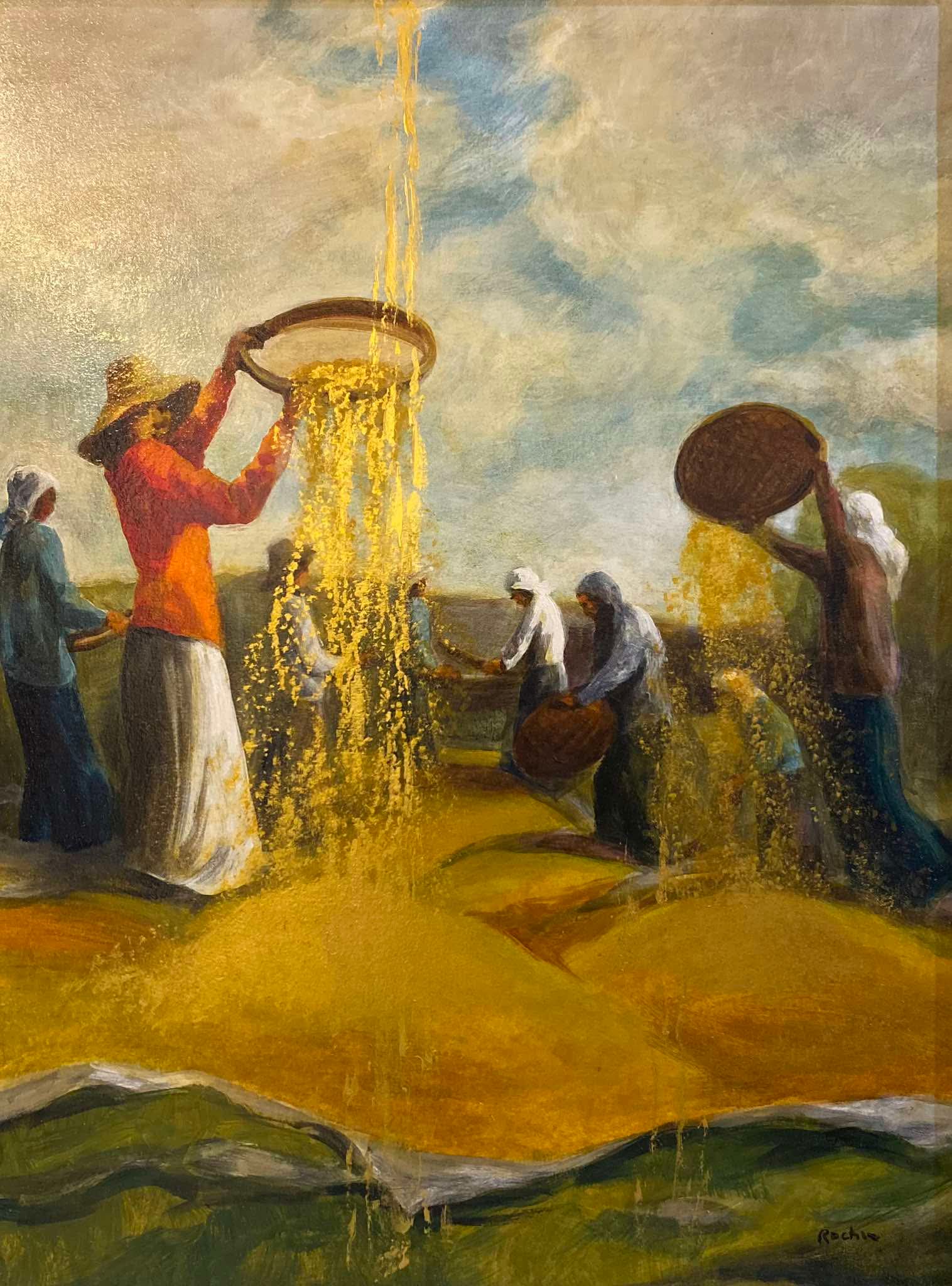 Best known for his portrayals of women, Rocha's landscape works, particularly those depicting figures in rural settings, reveal his greatest skill. His use of warm, golden tones in scenes of harvest and daily life conveys a sense of abundance and joy, while subtly exploring feelings of isolation and the quiet spaces between human interactions. Rocha's ability to weave traditional Filipino imagery with a contemporary lens creates a bridge between past and present, making his art deeply relevant to modern audiences especially those who have lived through recent global challenges.