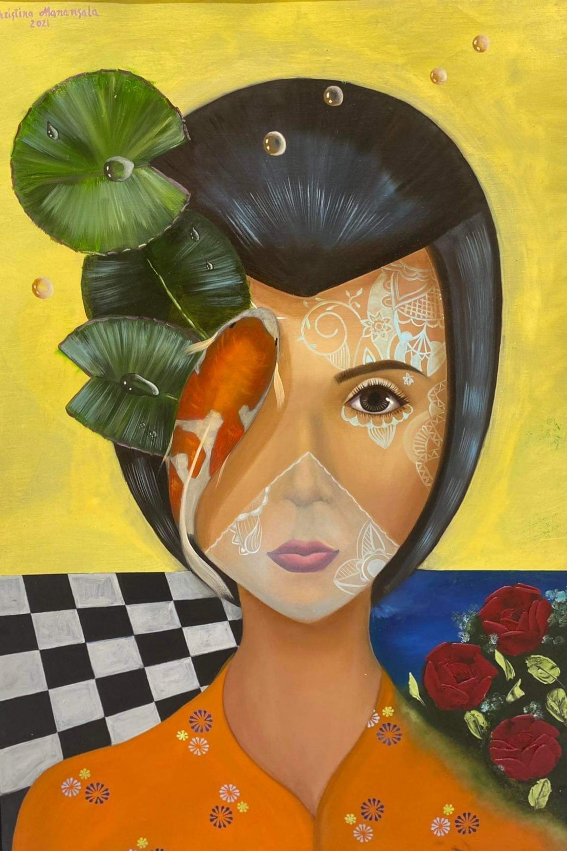 What makes Khristina’s works more interesting is that her women seem to always hide their emotions: their lips are tightly closed, and they often stare at the audience, blankly. With the added archetypes-the fish (symbol of agility, abundance, longevity, movement, etc.,) the Yin and Yang (the symbol of the male and female energies), among others. Khristina’s women have become the spirit of the Earth and the Cosmos in itself— self-containing, nurturing and powerful enough to create and destroy, recreate and rebuild anything and everything.