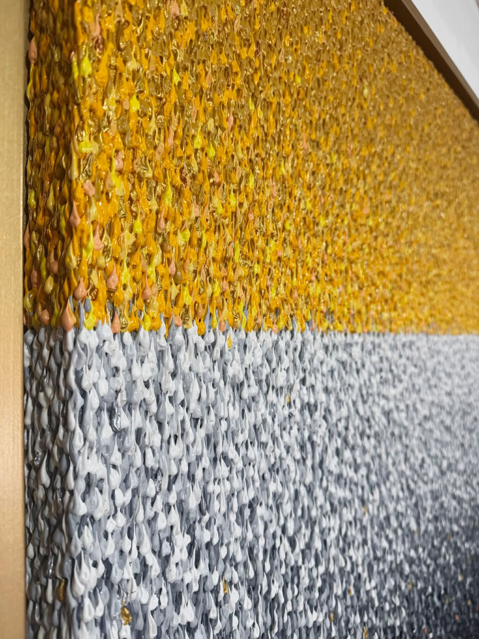 "Forest's Kiss" is a tale of the earth, a whispered moment between the trees and the soul. With a technique of tiny, deliberate dots, the artist paints a thousand breaths, each one catching the light and building a world where stillness moves. The texture on the canvas feels like the rough bark of old trees, every layer telling a story of time passing slow, like the way shadows fall at dusk. It’s a quiet kind of kiss, a soft touch between nature and the human heart, where the dots and textures come together to speak a language only the forest knows. The painting’s got a rhythm to it—one that you don’t hear, but you feel deep down in your bones. It’s the kind of moment where the world’s still, but something inside is stirring.