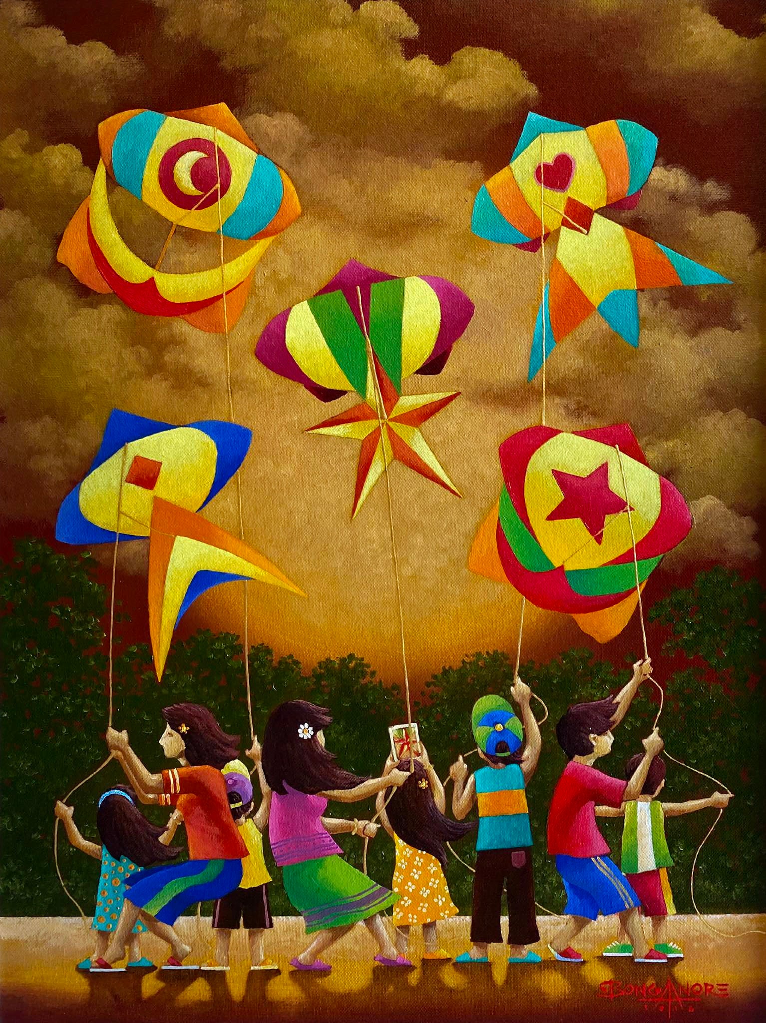 His painting is characterized by inanimate subjects of children both young and mature displaying and parading different sizes, shapes, forms colors, design and angles as well as the heights of kite flight in bold choice of colors, thereby creating a brilliant and bright effect in an effort to boost and awaken our mood and sense to a joyous and ecstatic jubilation of what kite and its flight was all about. He belleve that art such as these are meant to cure the lonely and inspire us to a positive and optimistic look in life and in its pursuit to achieve the unobtainable and obtain what is unachievable.