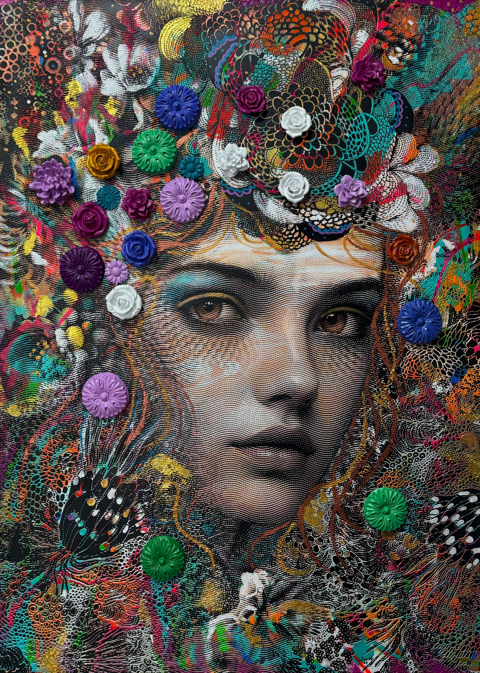The woman embodies the moon descending into the chaos of the earth - purity meeting entropy, light merging with matter.