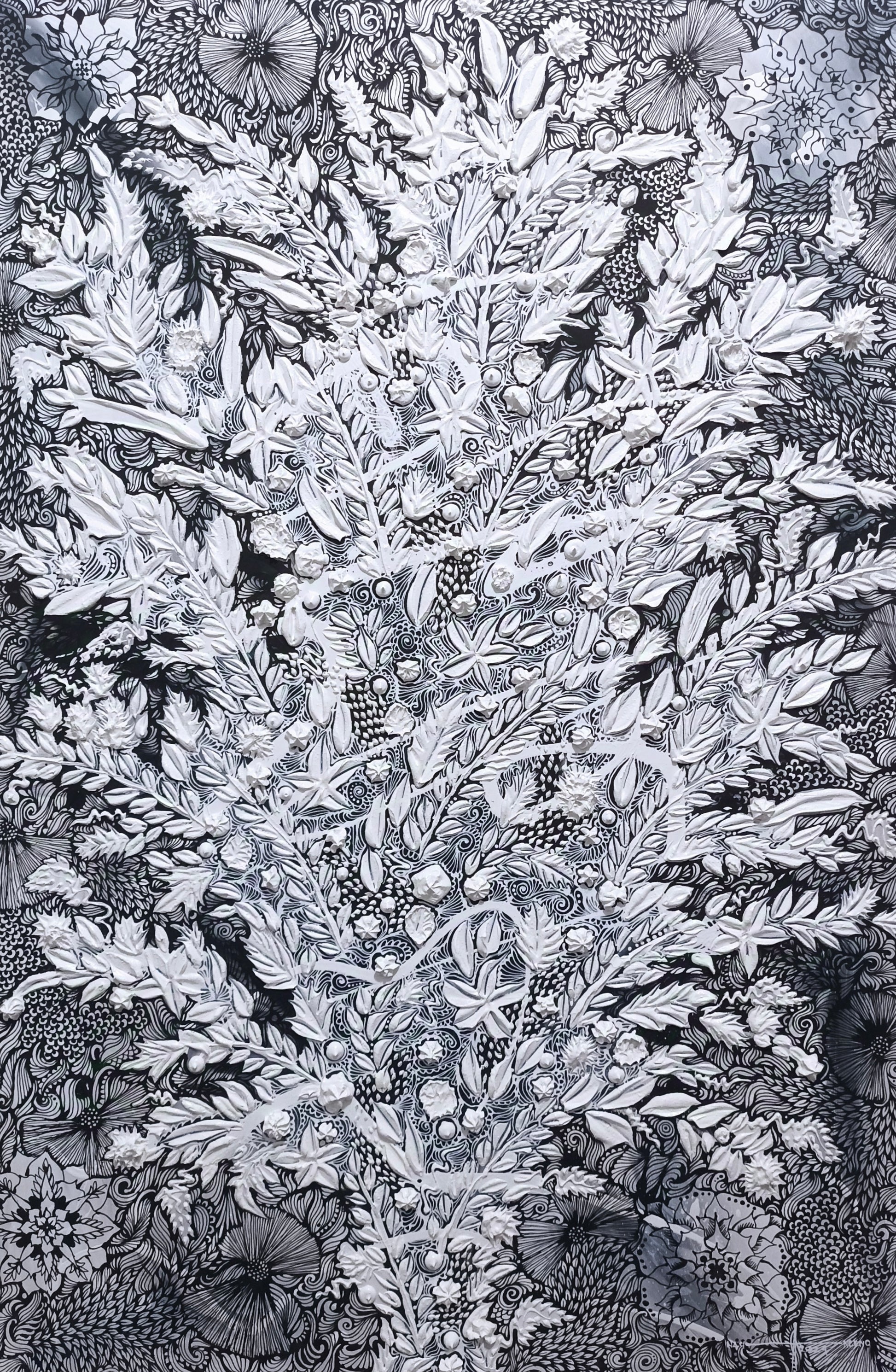 Notable for his monochromatic works that highlights the beauty of chaos and peace. Overlaying on a dynamic splashes of paints arrange an intricate details meticulously painted using brush and a special tool he himself created, Integrated with a highly textured surface achieved through a rigorous application using piping bags and palette knife.