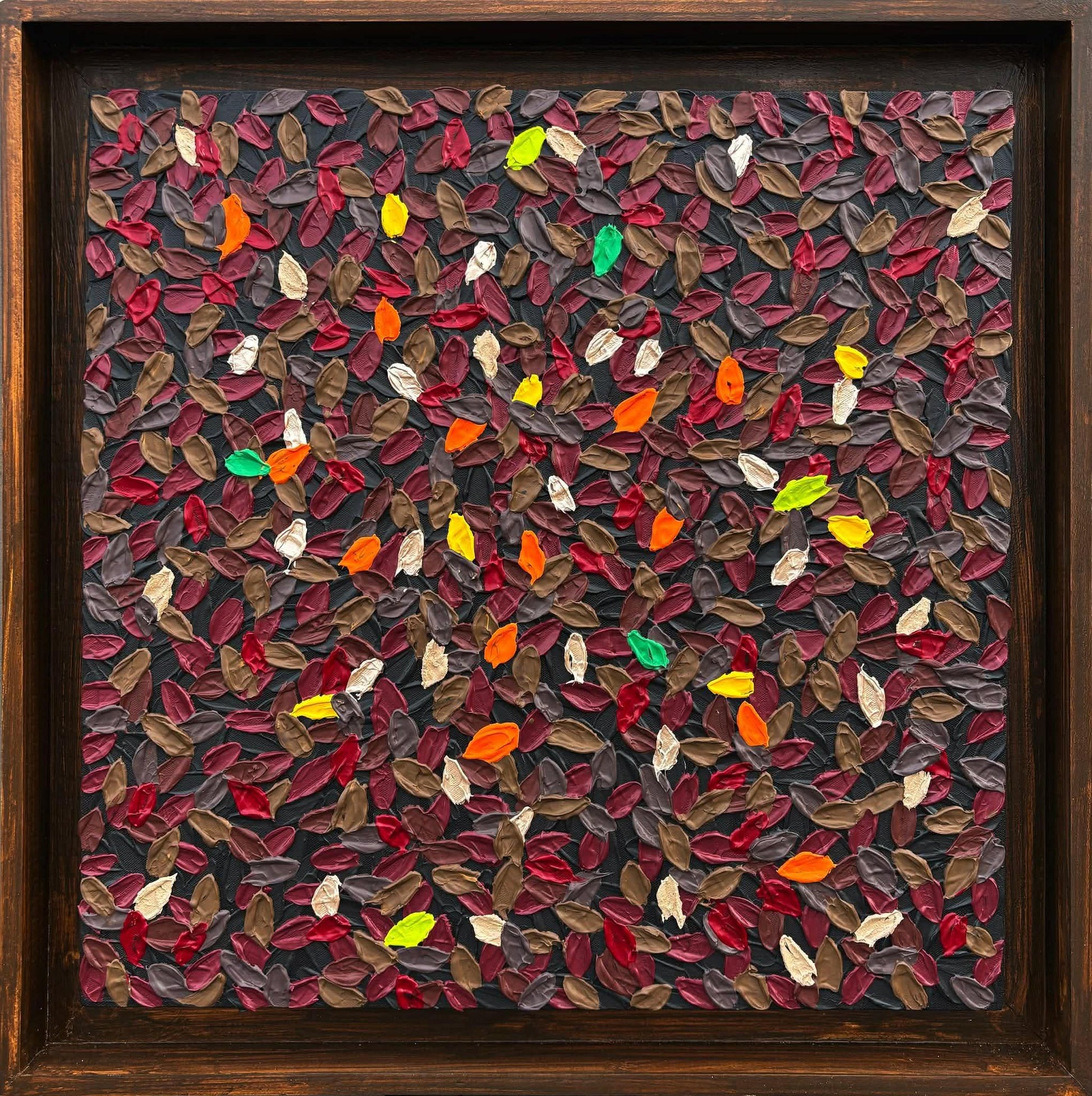 This painting gathers countless leaves into a vibrant tapestry, each one capturing a fleeting instant of nature’s quiet transformations. Together, they form a forest made not of trees, but of memories, small, colorful fragments that echo the passing seasons and the subtle stories carried by every leaf.