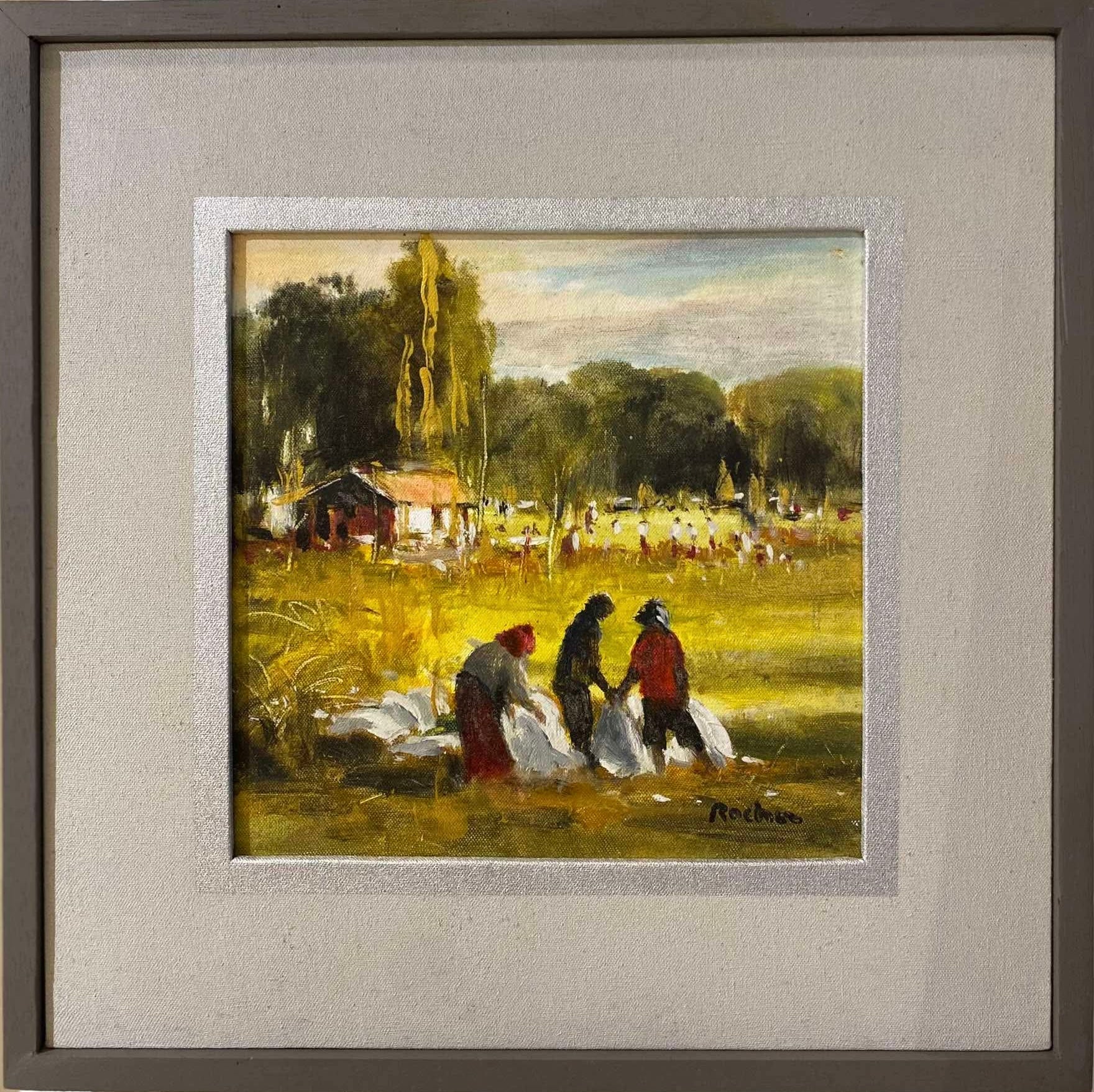 Best known for his portrayals of women, Rocha's landscape works, particularly those depicting figures in rural settings, reveal his greatest skill. His use of warm, golden tones in scenes of harvest and daily life conveys a sense of abundance and joy, while subtly exploring feelings of isolation and the quiet spaces between human interactions. Rocha's ability to weave traditional Filipino imagery with a contemporary lens creates a bridge between past and present, making his art deeply relevant to modern audiences especially those who have lived through recent global challenges.