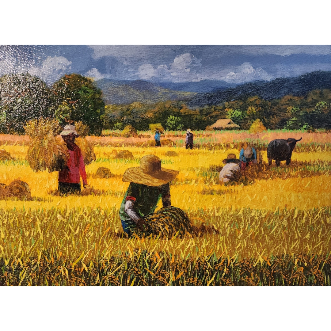 Amazing executed harvest masterpieces, intricately detailed still life, and perfect hues; these remind us of the great Fernando Cueto Amorsolo and defines him as a genuinely phenomenal visual artist; Ojing Señara has recreated himself from his early works of "realtoons" a coined word for realism and cartoon characters in one sensible composition. "Realtoons" greatly amused his patrons as it was a reflection of life's reality in a positive, adventurous and light hearted way.