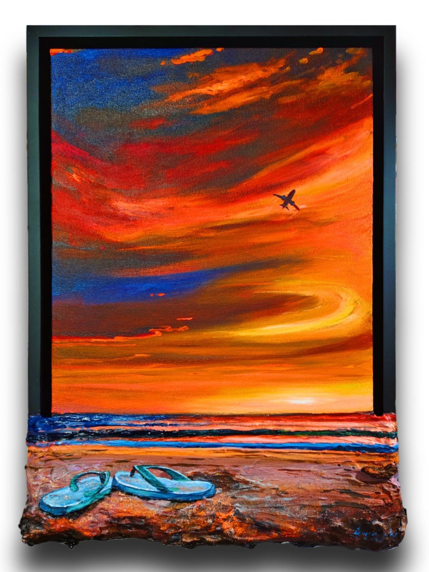 His popular red balloon, flying freely in reddish, dreamy skies and the quiet seas serenely touching the shore, signify his beliefs or philosophy as an artist—while you are aiming high for your dream, you need to keep your firmly planted in the ground.