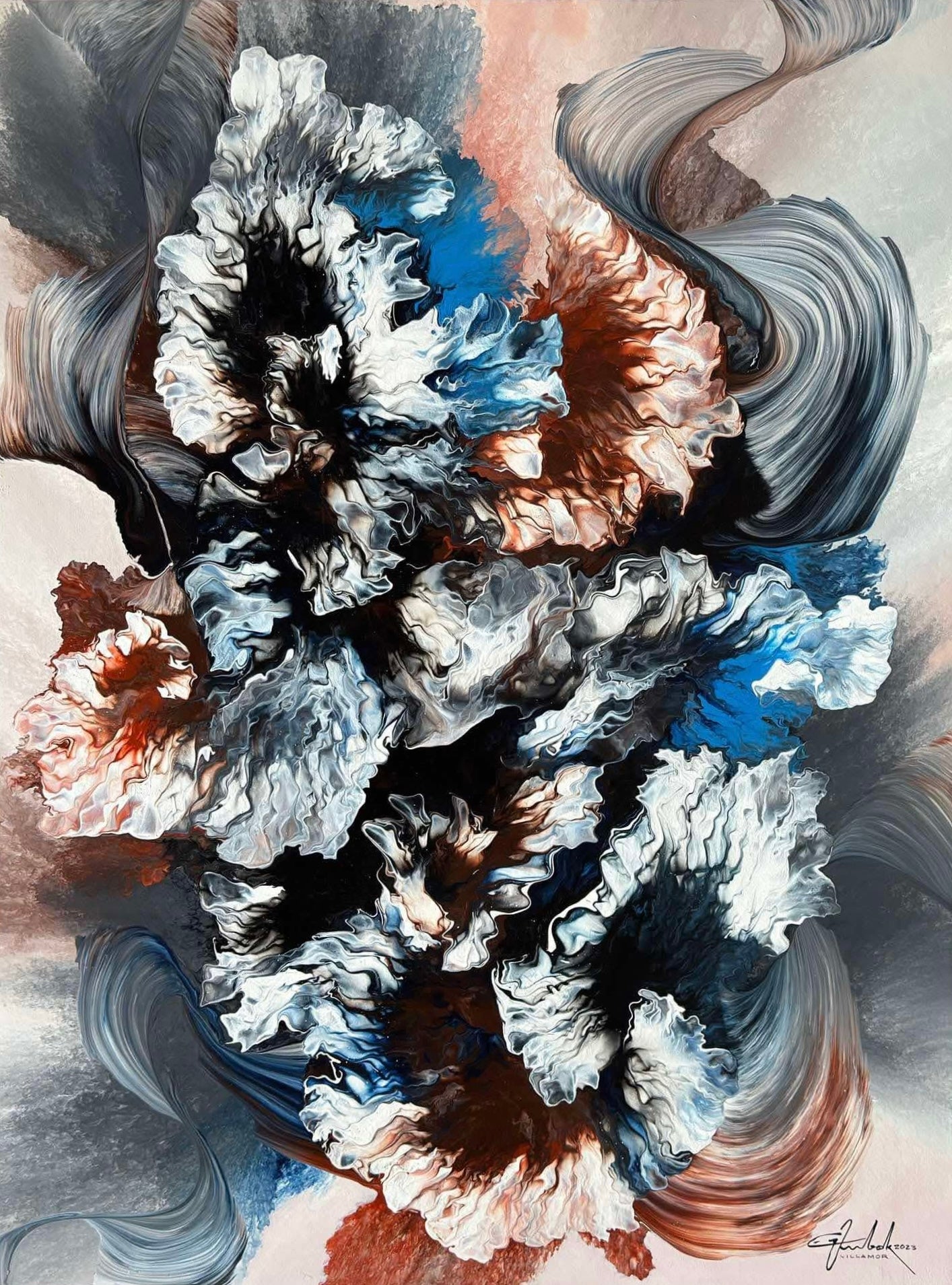 “Ombok” Villamor (b. 1979), whose recent oeuvre is characterized by fascinating abstractions of life-forms. The resulting paintings are organic narratives that bring out the rich dynamism and energy of life. This is keeping with the artist’s own explorations of nature—particularly his experience living on the shores of his native Samar in central Philippines. The ethereal paintings are most reminiscent of the country’s sea-life – a direct link to the artist’s roots – but they also celebrate the delights of other life-forms. In many cases, his paintings take on an almost spiritual essence—looking like they are floating life-nurturing galaxies in the middle of the vacuum of space.