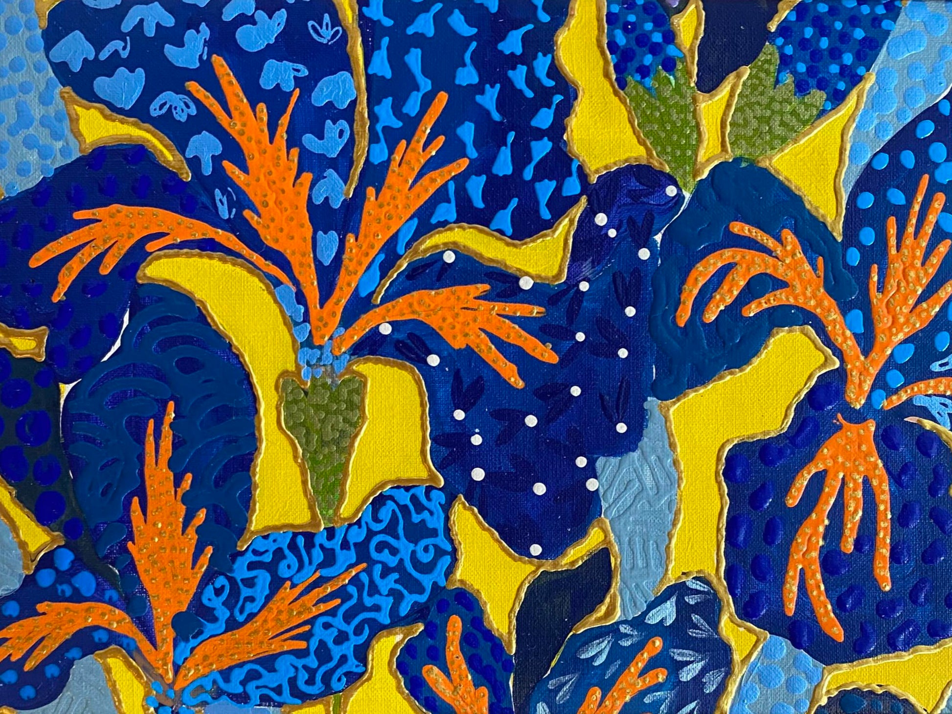 Les Belle Fleurs is evidence of Quito's mastery of patterns and the dance betweek sharp lines and billows. Her layering, which we also observe in the propagation of plants, signifies that growth is life. Quito's transformation from realism to abstractionism underscores the evolution that was due. Quito is not one to sit still when the wanderlust calls. Even from afar, she will hear the blooming of flowers. Calla Lilies, roses, tulips, poppies, and sunflowers are representations of the sacredness of the tansmutation of personal tribulations that are unheard of by most. The colors yield to glorious epiphanies rather than succumb to sorrow. Certain times call for such to happen.