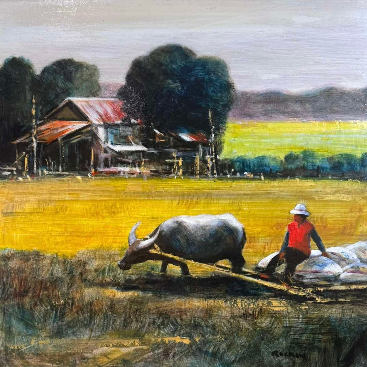 Best known for his portrayals of women, Rocha's landscape works, particularly those depicting figures in rural settings, reveal his greatest skill. His use of warm, golden tones in scenes of harvest and daily life conveys a sense of abundance and joy, while subtly exploring feelings of isolation and the quiet spaces between human interactions. Rocha's ability to weave traditional Filipino imagery with a contemporary lens creates a bridge between past and present, making his art deeply relevant to modern audiences especially those who have lived through recent global challenges.
