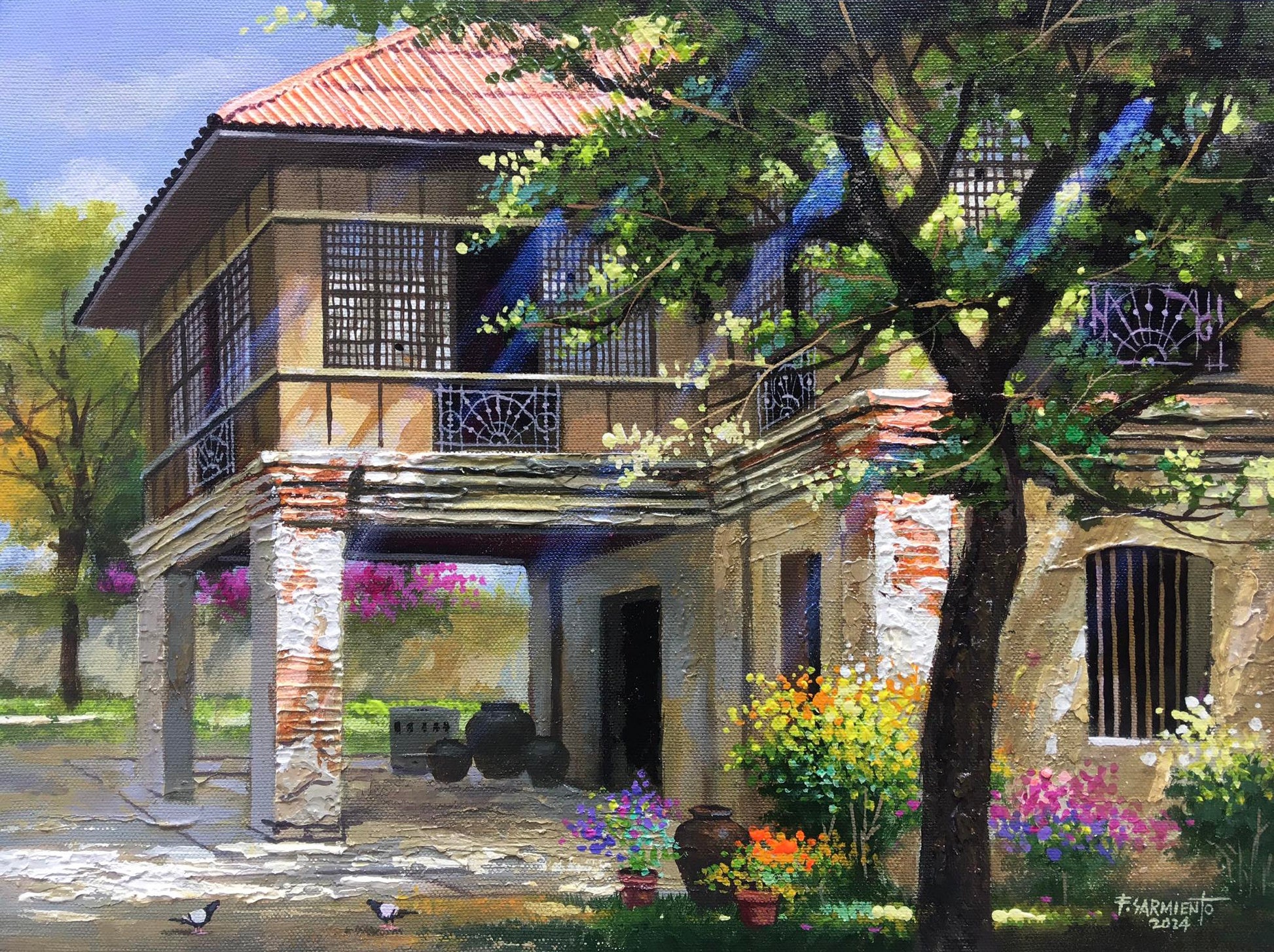 Unequivocal mastery of heritage houses in alluring setting; the subtle hues and perfect perspective adorn with vivid floral accents define the works of Fidel Malig Sarmiento.