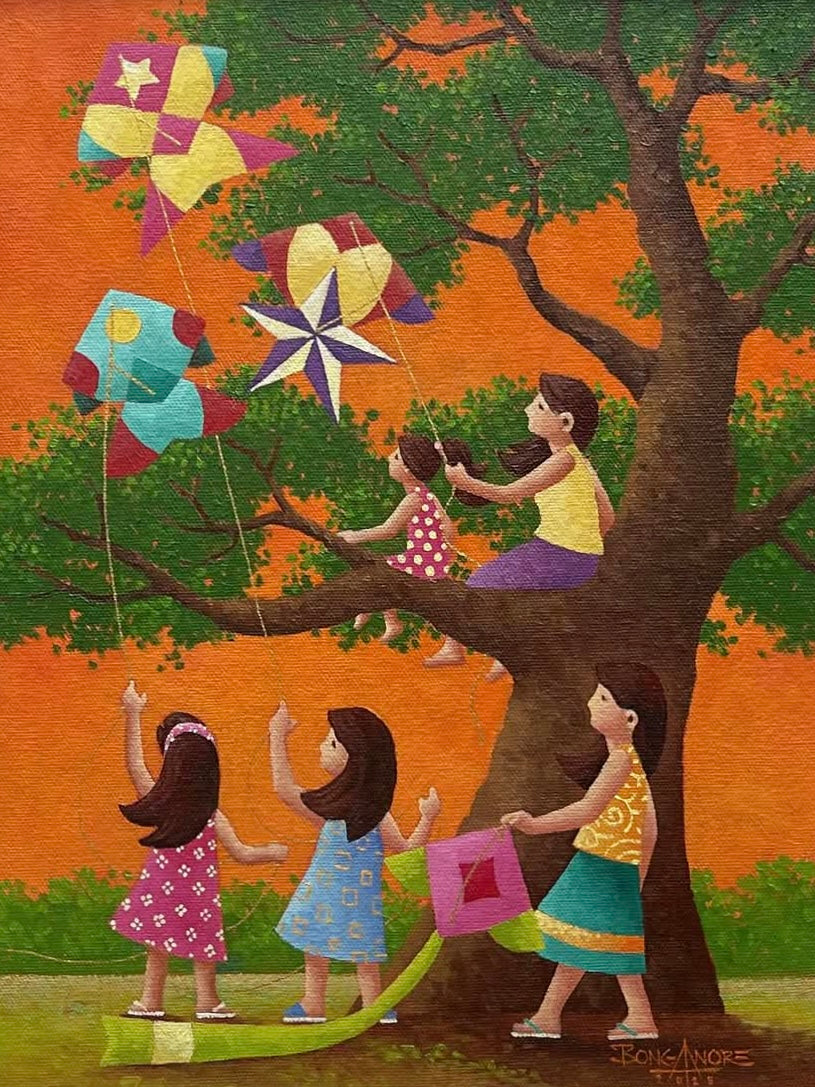 His painting is characterized by inanimate subjects of children both young and mature displaying and parading different sizes, shapes, forms colors, design and angles as well as the heights of kite flight in bold choice of colors, thereby creating a brilliant and bright effect in an effort to boost and awaken our mood and sense to a joyous and ecstatic jubilation of what kite and its flight was all about. He belleve that art such as these are meant to cure the lonely and inspire us to a positive and optimistic look in life and in its pursuit to achieve the unobtainable and obtain what is unachievable.