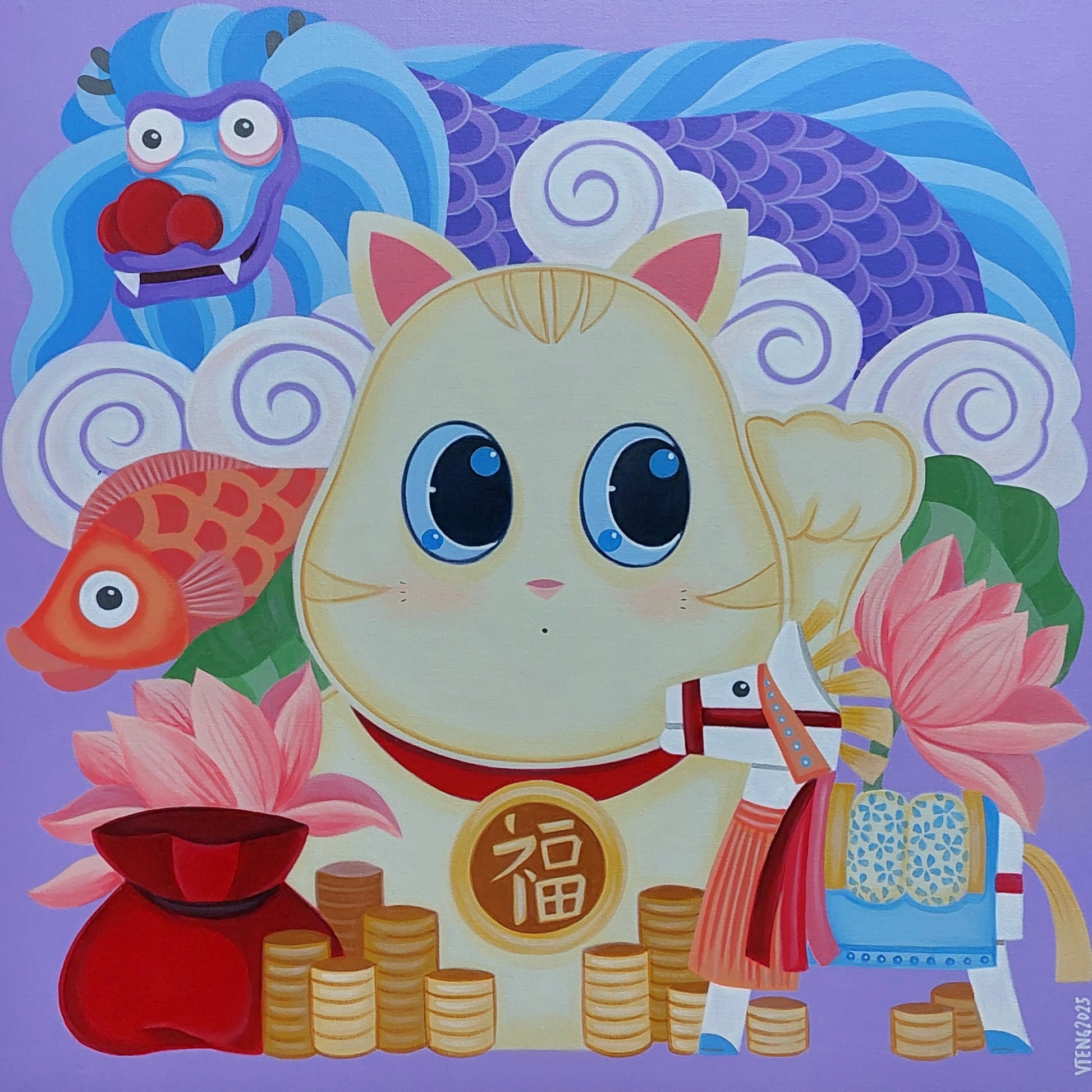 Highlighting also her Chinese background, subjects used are those that depict luck. With acrylic as her main medium, she has developed a technique wherein layers are created to manipulate opacity, thereby giving the impression as if the artwork was done in watercolor.