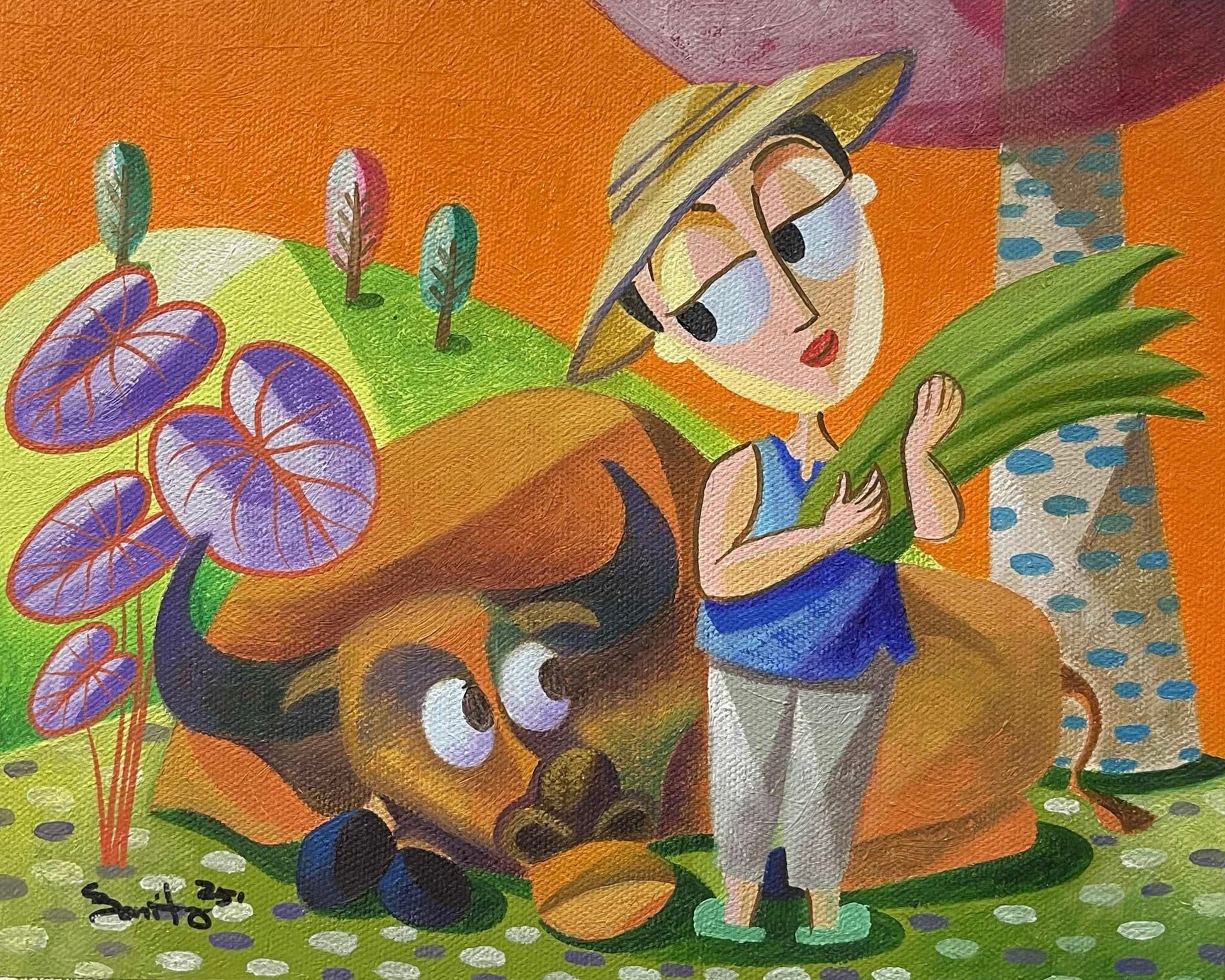 When drawing the eyes of her figures, Benito drew inspiration from the rounded eyes of his mongrel dog, Chaka to give her figures a choice of emotions. Morada then brought her first painting to Galerie Joaquin hoping to give her a dedicated place to exhibit her works. At this period, Benito created her Fernando Amorsolo inspired series of Fish Harvest, Market Scenes, Planting Rice and Rice Harvest which led her to her first one-woman exhibition, Eyes Wide Open at the Galerie Joaquin in 2007 highlighting her market scenes. The following year, Pan de Manila commissioned Benito to paint 2013 (Makulay at makabuluhang pasko ng pan De manila