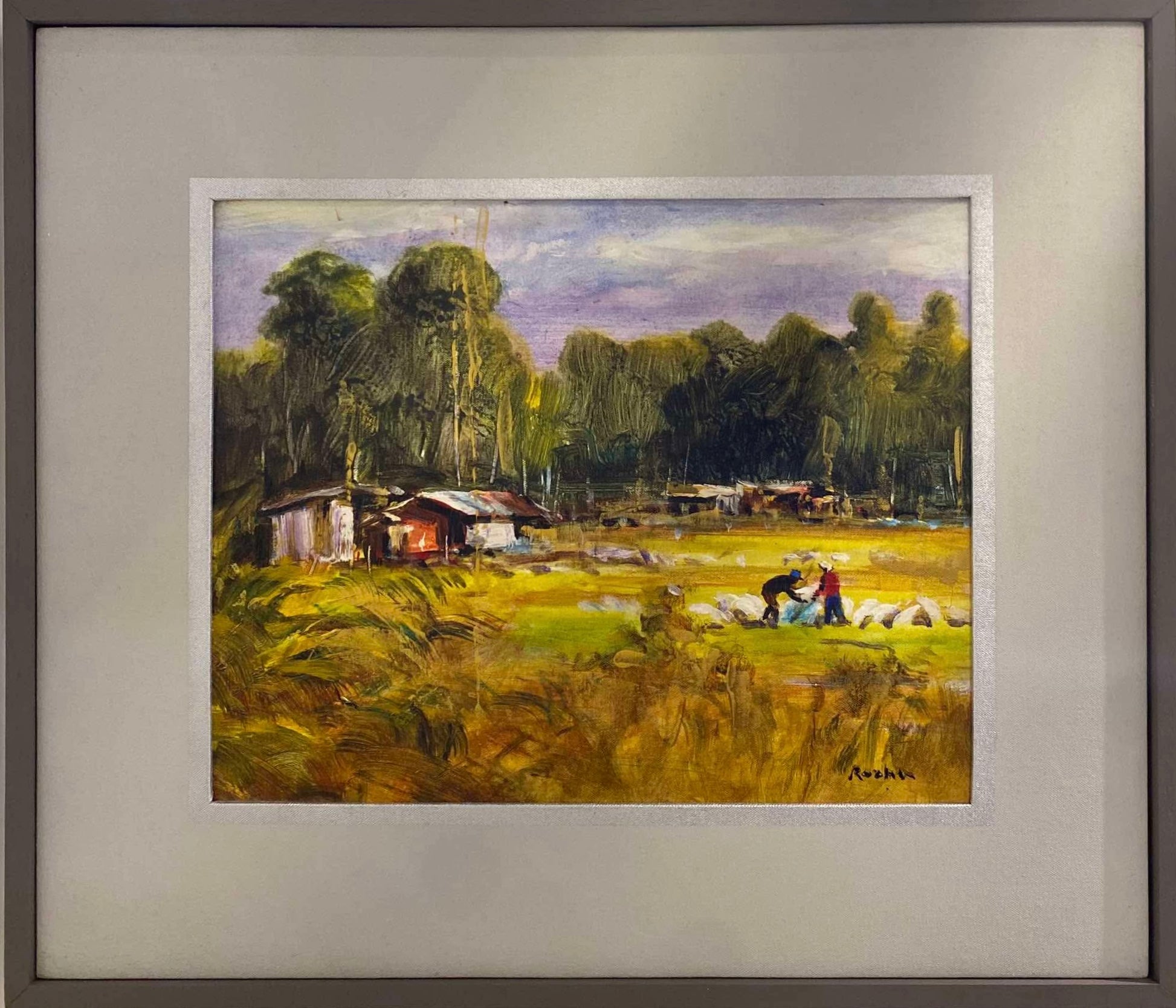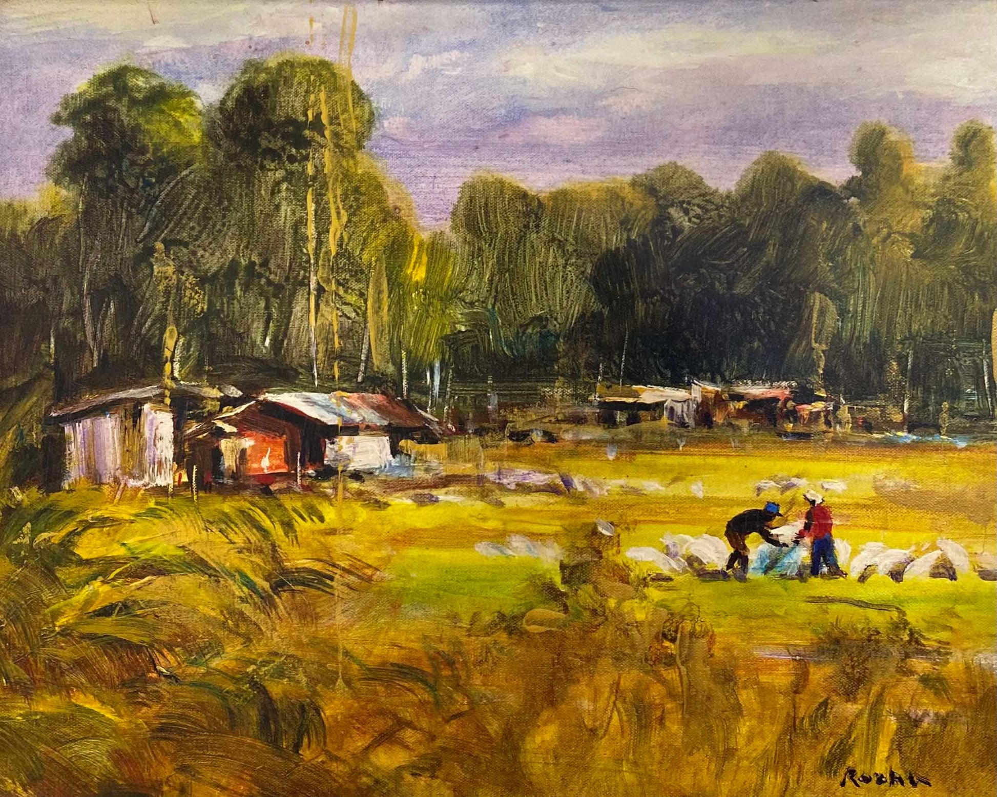 Best known for his portrayals of women, Rocha's landscape works, particularly those depicting figures in rural settings, reveal his greatest skill. His use of warm, golden tones in scenes of harvest and daily life conveys a sense of abundance and joy, while subtly exploring feelings of isolation and the quiet spaces between human interactions. Rocha's ability to weave traditional Filipino imagery with a contemporary lens creates a bridge between past and present, making his art deeply relevant to modern audiences especially those who have lived through recent global challenges.
