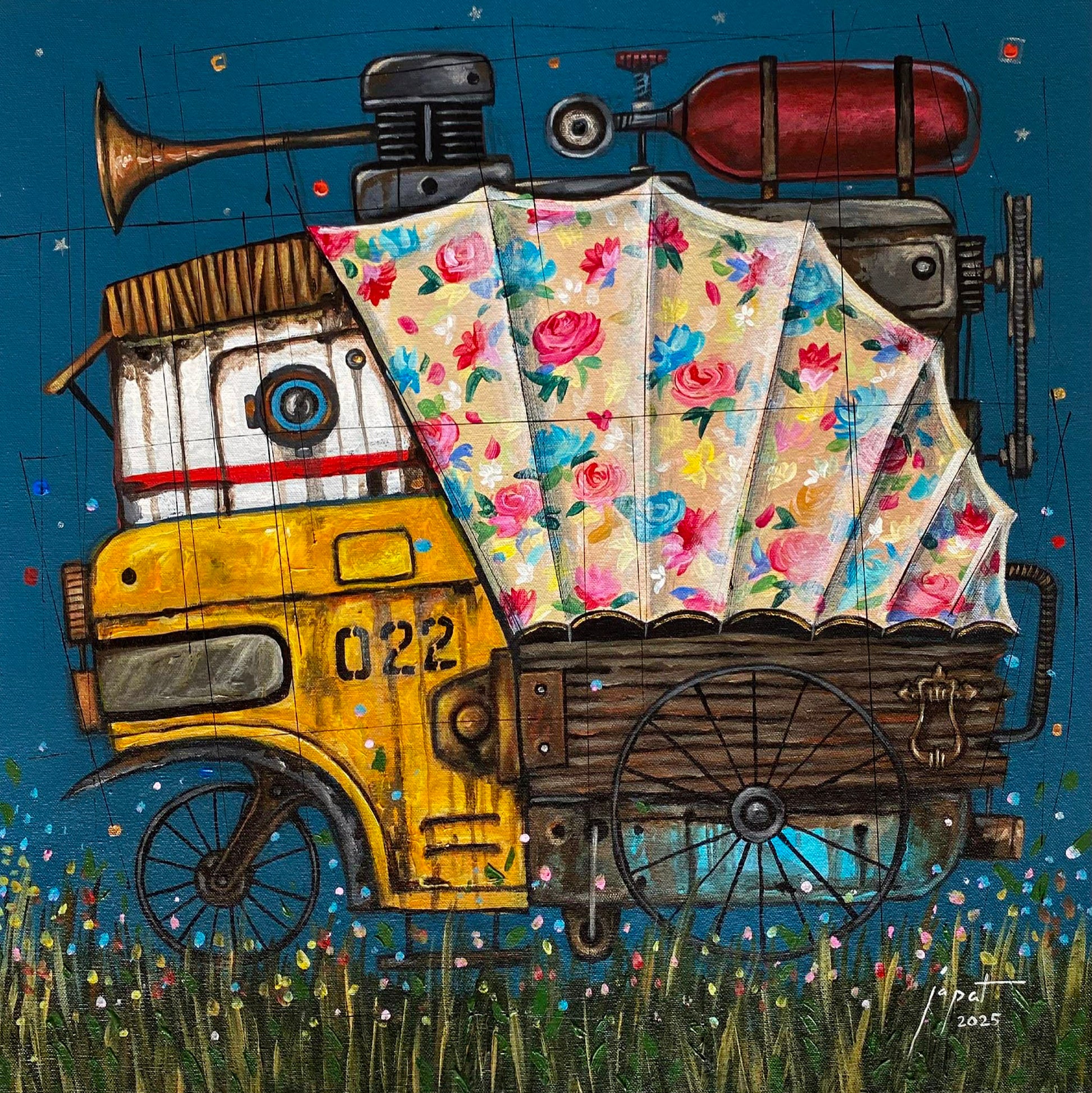 For Gueverra, his life is an unending journey. He lived in several places and now resides in Pila Laguna. It can be compared to his machines that could be rancid; but, becomes more valuable as it ages. To such, it never hinders nor slows down his run; rather, makes him a better person through time. Moreover, the horns in his vehicles personifies him. To connect, his social media represents him as a harbinger of witty, gregarious and cool remarks- always beaming enthusiasm and positivity despite life challenges. His characters wearing an overall with mask and goggles signifies battle readiness while the cargo it carries represent material possessions and fond good memories imbedded in motivation. Most of all, for Guevarra, life is ephemeral; and he believes that, through faith and grit one must do everything to stay afloat and be successful.