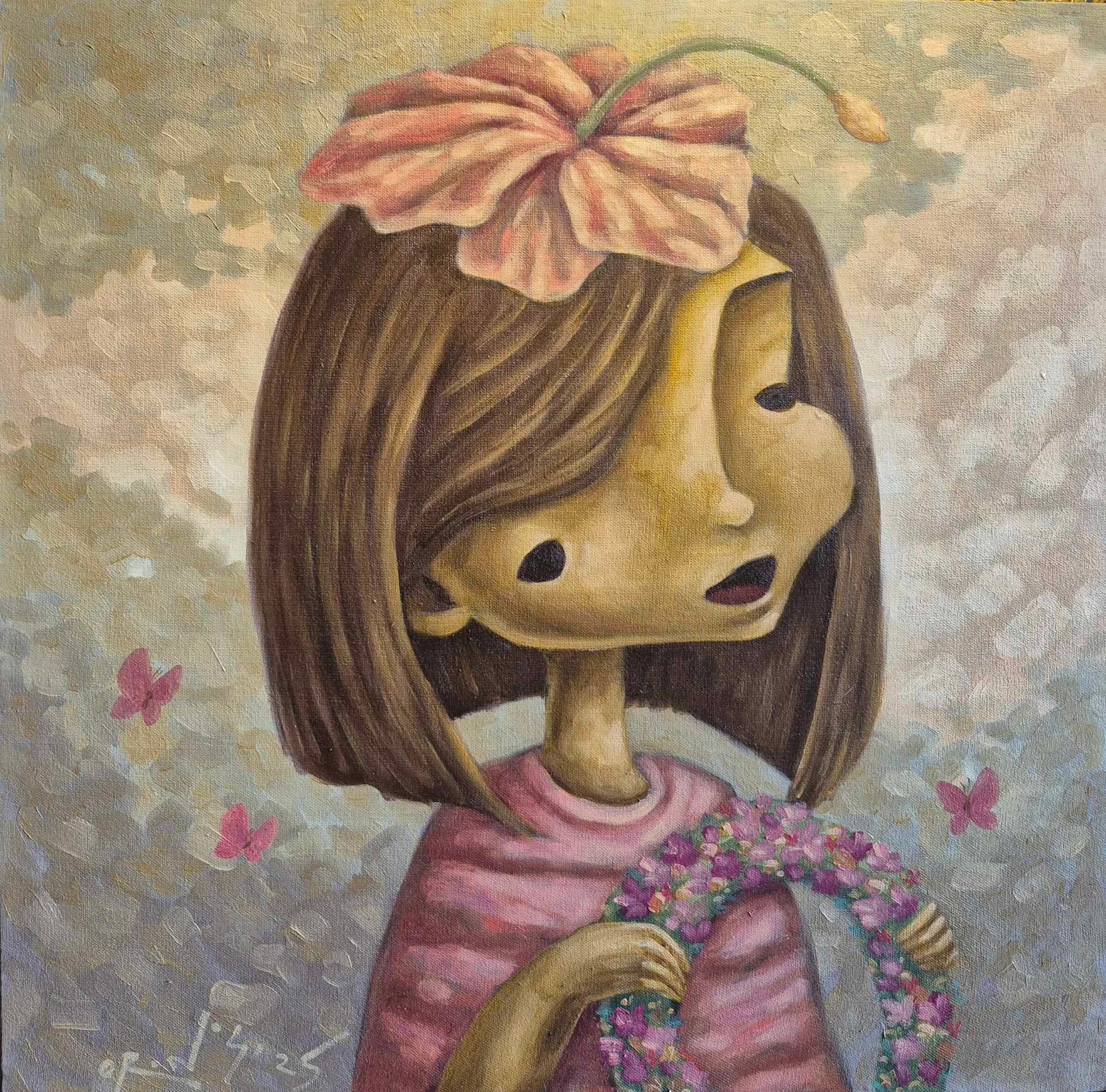 Bernardo Oronos Jr. (b. 2000) of Rosario is for most part, a self-taught painter. However, the guidance of Joseph Albao also helped him develop his craft. His first works were caricatures but have since metamorphosed to acrylic painting.