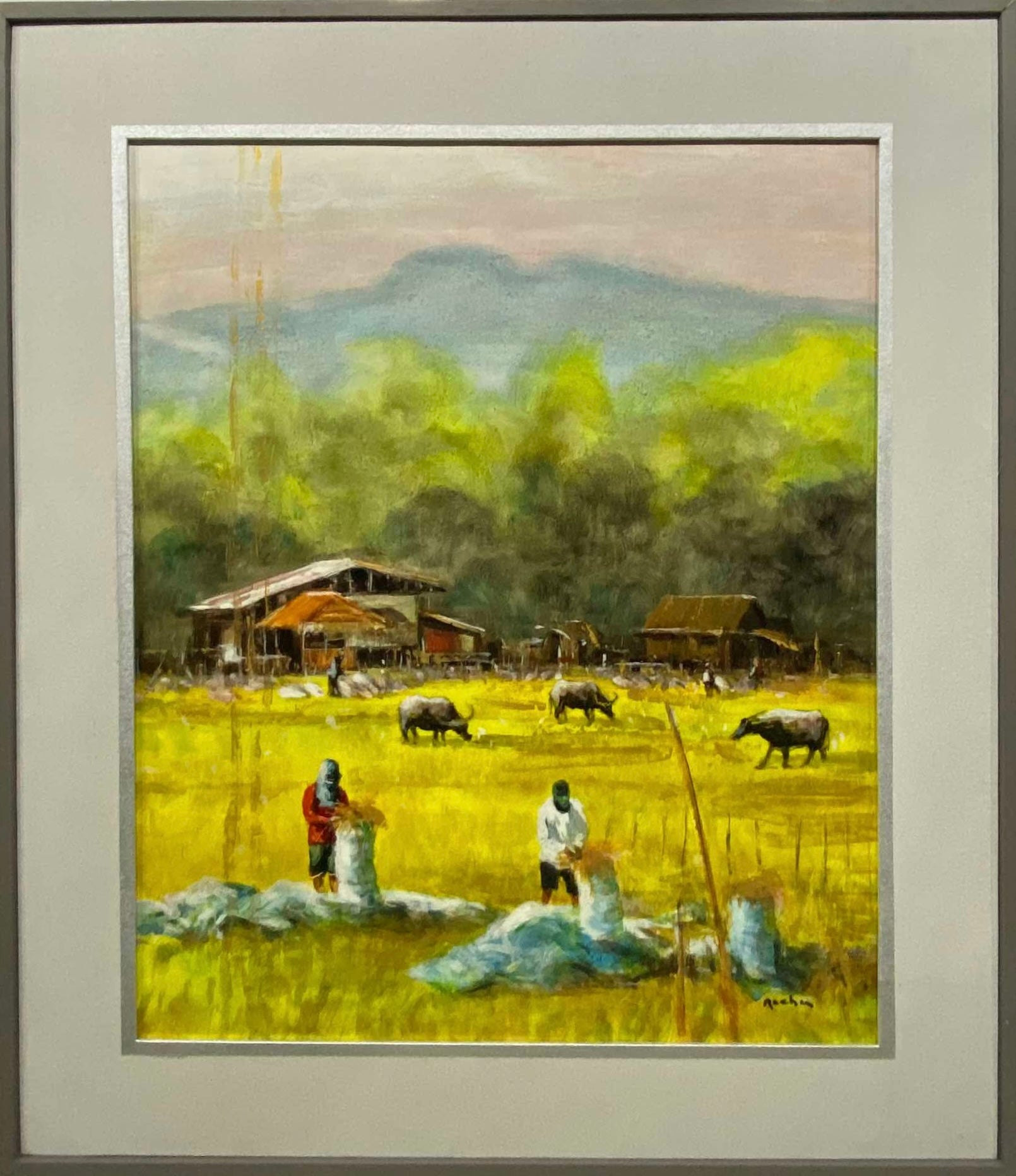 Best known for his portrayals of women, Rocha's landscape works, particularly those depicting figures in rural settings, reveal his greatest skill. His use of warm, golden tones in scenes of harvest and daily life conveys a sense of abundance and joy, while subtly exploring feelings of isolation and the quiet spaces between human interactions. Rocha's ability to weave traditional Filipino imagery with a contemporary lens creates a bridge between past and present, making his art deeply relevant to modern audiences especially those who have lived through recent global challenges.
