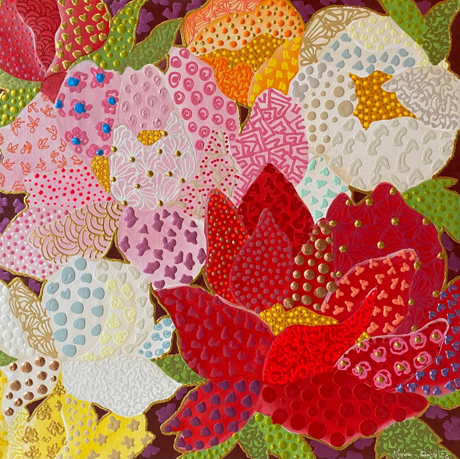 Les Belle Fleurs is evidence of Quito's mastery of patterns and the dance betweek sharp lines and billows. Her layering, which we also observe in the propagation of plants, signifies that growth is life. Quito's transformation from realism to abstractionism underscores the evolution that was due. Quito is not one to sit still when the wanderlust calls. Even from afar, she will hear the blooming of flowers. Calla Lilies, roses, tulips, poppies, and sunflowers are representations of the sacredness of the tansmutation of personal tribulations that are unheard of by most. The colors yield to glorious epiphanies rather than succumb to sorrow. Certain times call for such to happen.