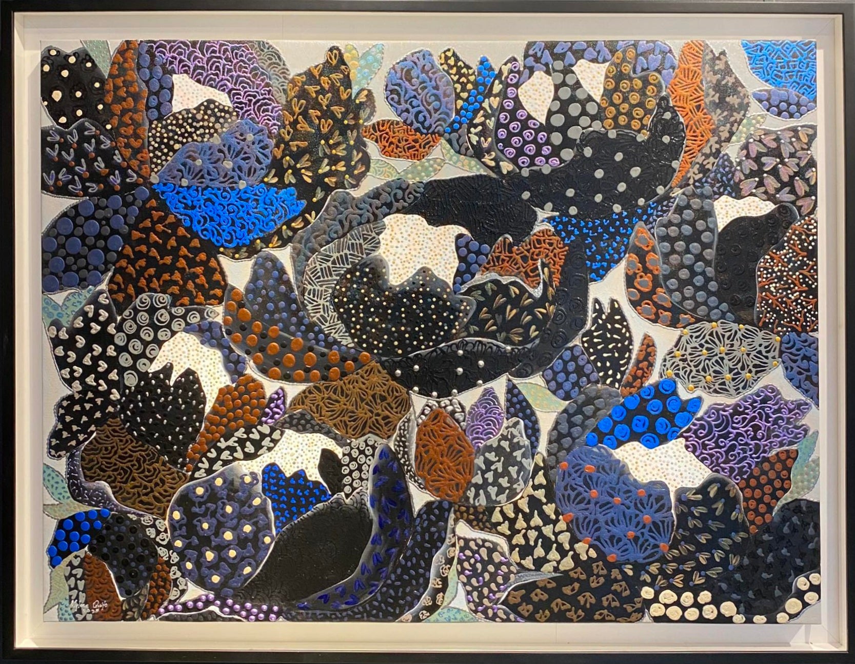 Les Belle Fleurs is evidence of Quito's mastery of patterns and the dance betweek sharp lines and billows. Her layering, which we also observe in the propagation of plants, signifies that growth is life. Quito's transformation from realism to abstractionism underscores the evolution that was due. Quito is not one to sit still when the wanderlust calls. Even from afar, she will hear the blooming of flowers. Calla Lilies, roses, tulips, poppies, and sunflowers are representations of the sacredness of the tansmutation of personal tribulations that are unheard of by most. The colors yield to glorious epiphanies rather than succumb to sorrow. Certain times call for such to happen.