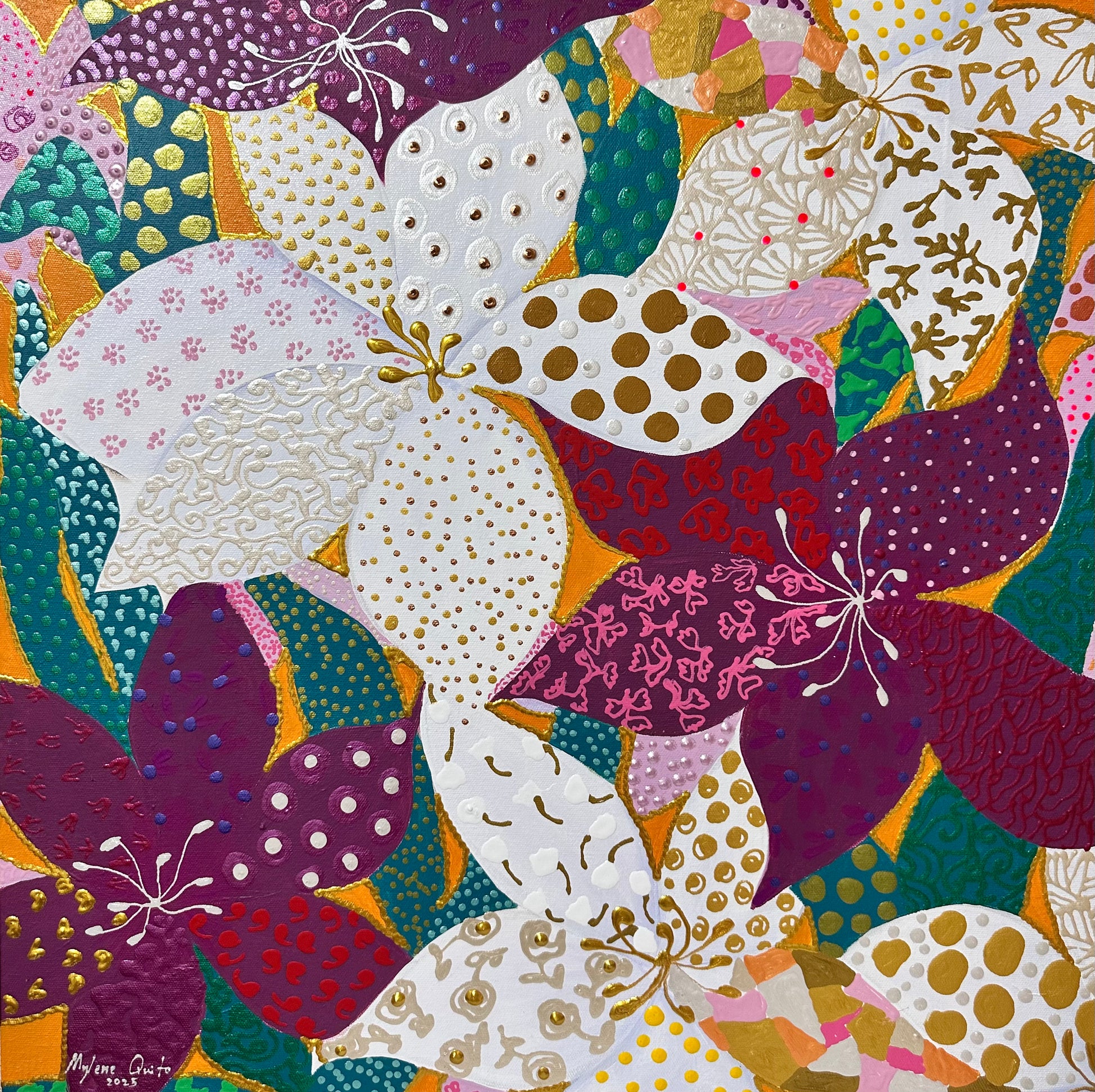 Les Belle Fleurs is evidence of Quito's mastery of patterns and the dance betweek sharp lines and billows. Her layering, which we also observe in the propagation of plants, signifies that growth is life. Quito's transformation from realism to abstractionism underscores the evolution that was due. Quito is not one to sit still when the wanderlust calls. Even from afar, she will hear the blooming of flowers. Calla Lilies, roses, tulips, poppies, and sunflowers are representations of the sacredness of the tansmutation of personal tribulations that are unheard of by most. The colors yield to glorious epiphanies rather than succumb to sorrow. Certain times call for such to happen.