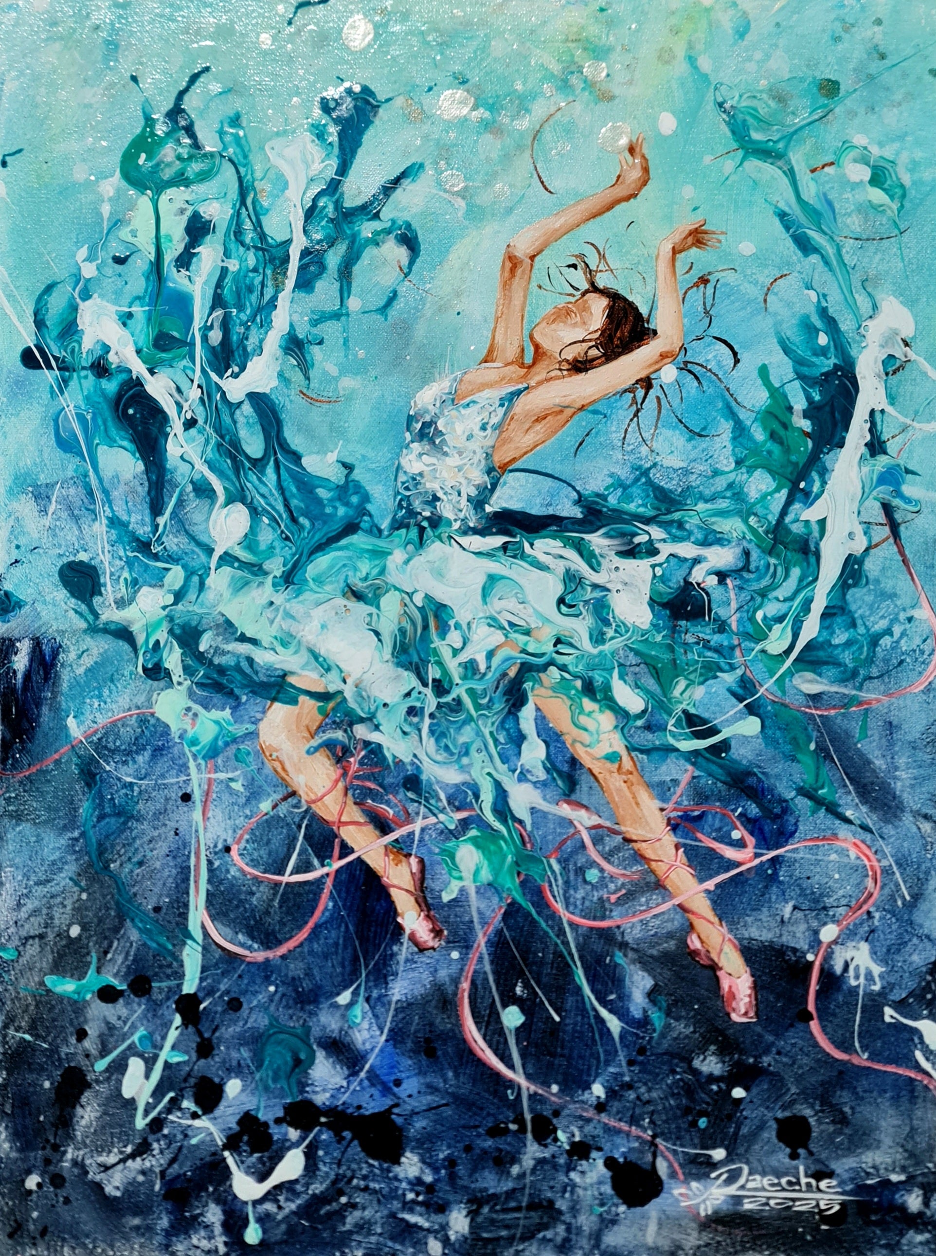 Expressions in movement. The artist paints as to where her colors lead her. Rich and bright tones – blues, purples – with a fluid style that captures the essence of her subject through the motions it possesses. Diverse poses, raw and spontaneous, that depict the fleeting nature of an expression, be it elemental or emotional.