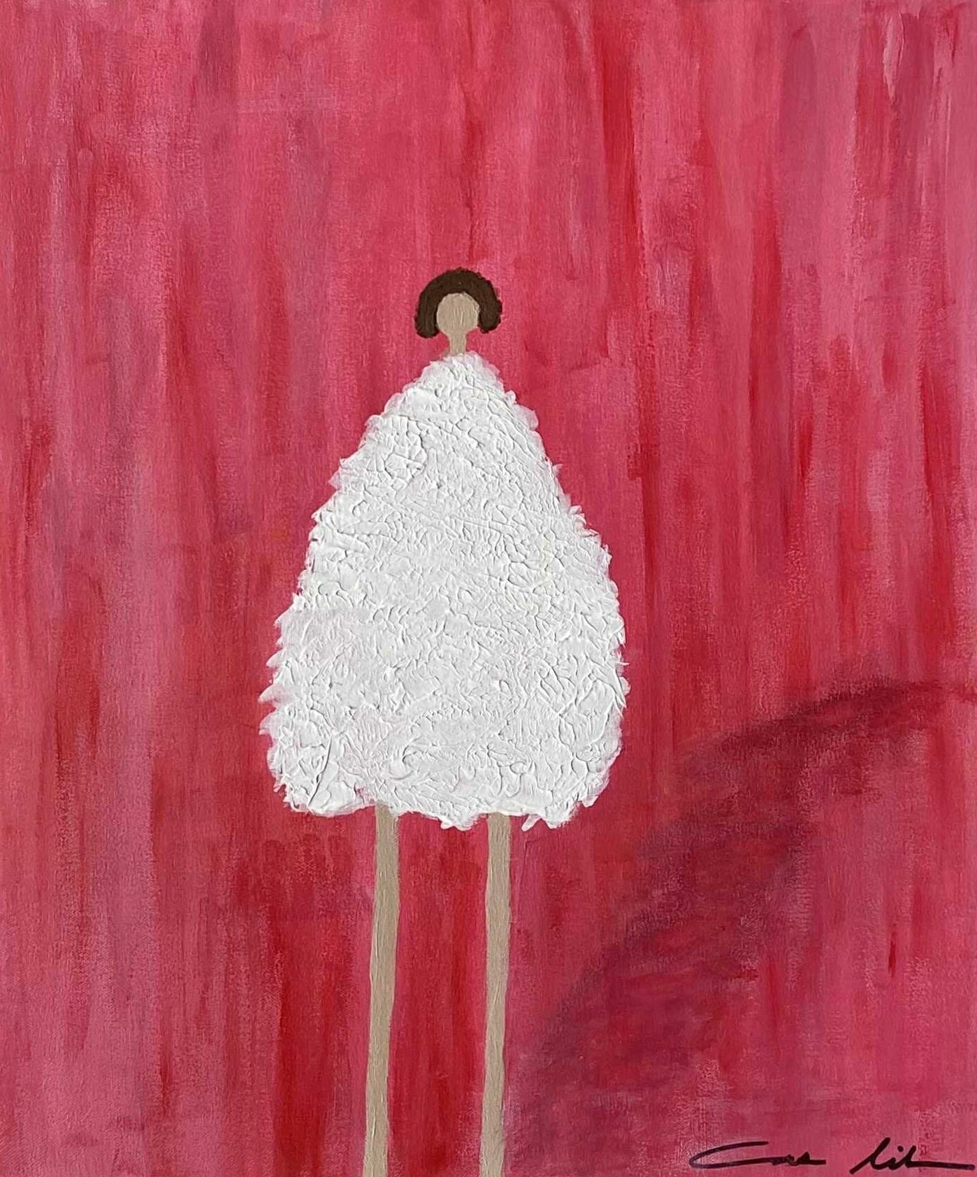 This title emphasizes the quiet defiance and dignity of the figure, suggesting resilience and grace in the face of intensity—symbolized by the rich red backdrop. The minimalism draws power from simplicity, and the textured form adds depth to her presence.