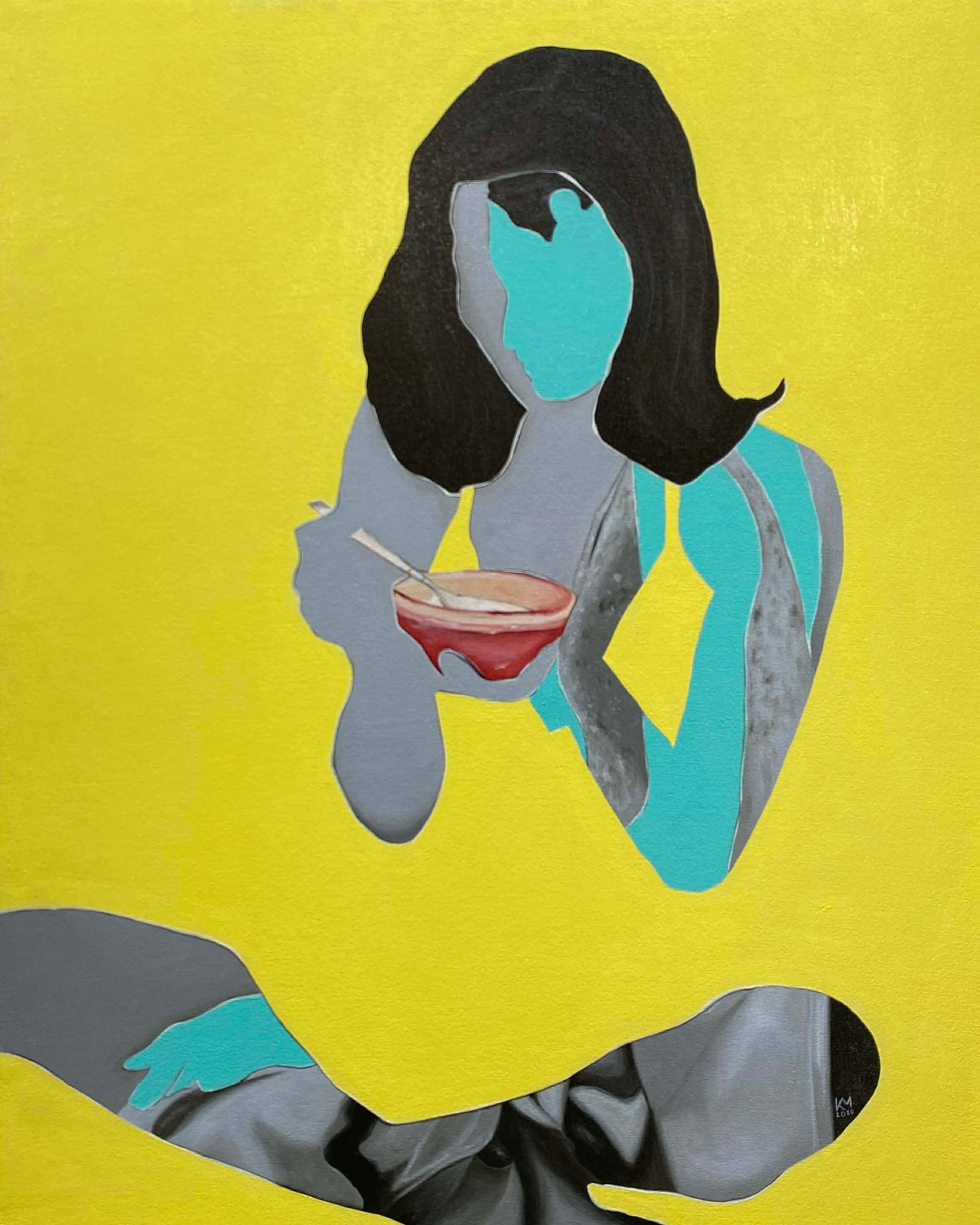 In recent years, her practice has undergone a quiet but decisive shift inward. While retaining the visual clarity and immediacy of pop, KEEM’s current body of work shifts toward psychological figurativism—a mode of image-making that focuses on internal dialogue, emotional regulation, and the unseen labor of selfhood. Through silhouetted figures, negative space, collaged interiors, and saturated color fields, her works map states of hesitation, restraint, anxiety, faith, and grace. The body becomes a vessel for inner landscapes rather than an object of spectacle, and bold color functions not as decoration but as emotional pressure, noise, or containment.