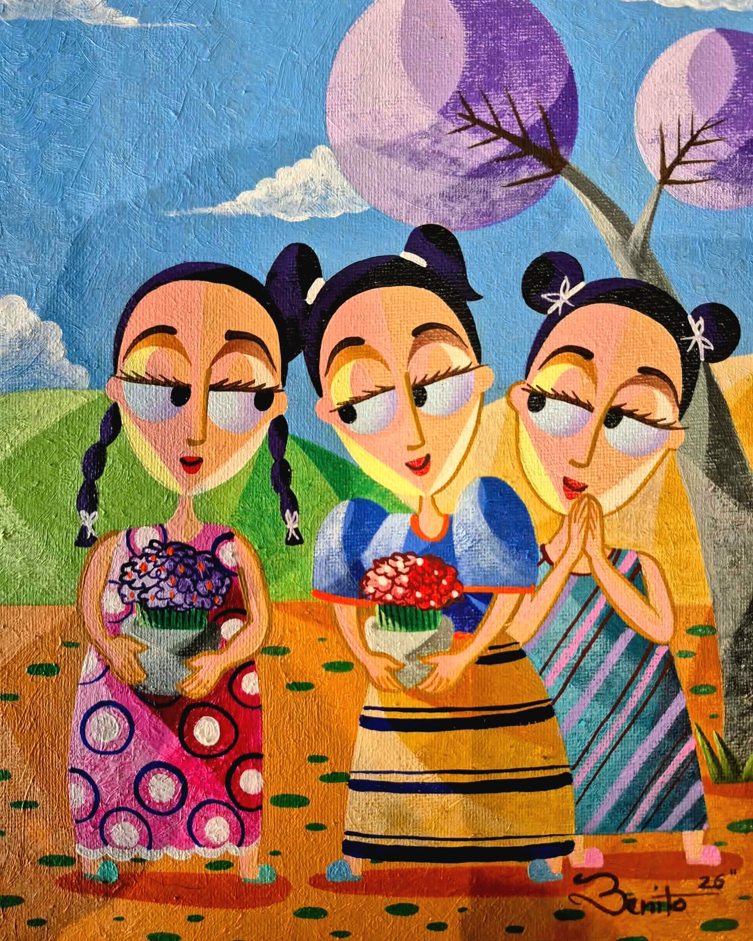 In 2003, Jovan Benito was introduced by her friend, Jennylyn Morada to her painter-brother, Jerry who straightaway caught his fancy. As the two went along with their relationship, her apprenticeship under him also began to commence which got her started to the rudimentary of oil painting. As part of her training, Morada left her a blank canvas in the studio to pursue anything that she liked and so she turned up a busy market scene with harried market vendors and shoppers donned in colorful Filipiniana attires all wanting to finish their morning tasks.