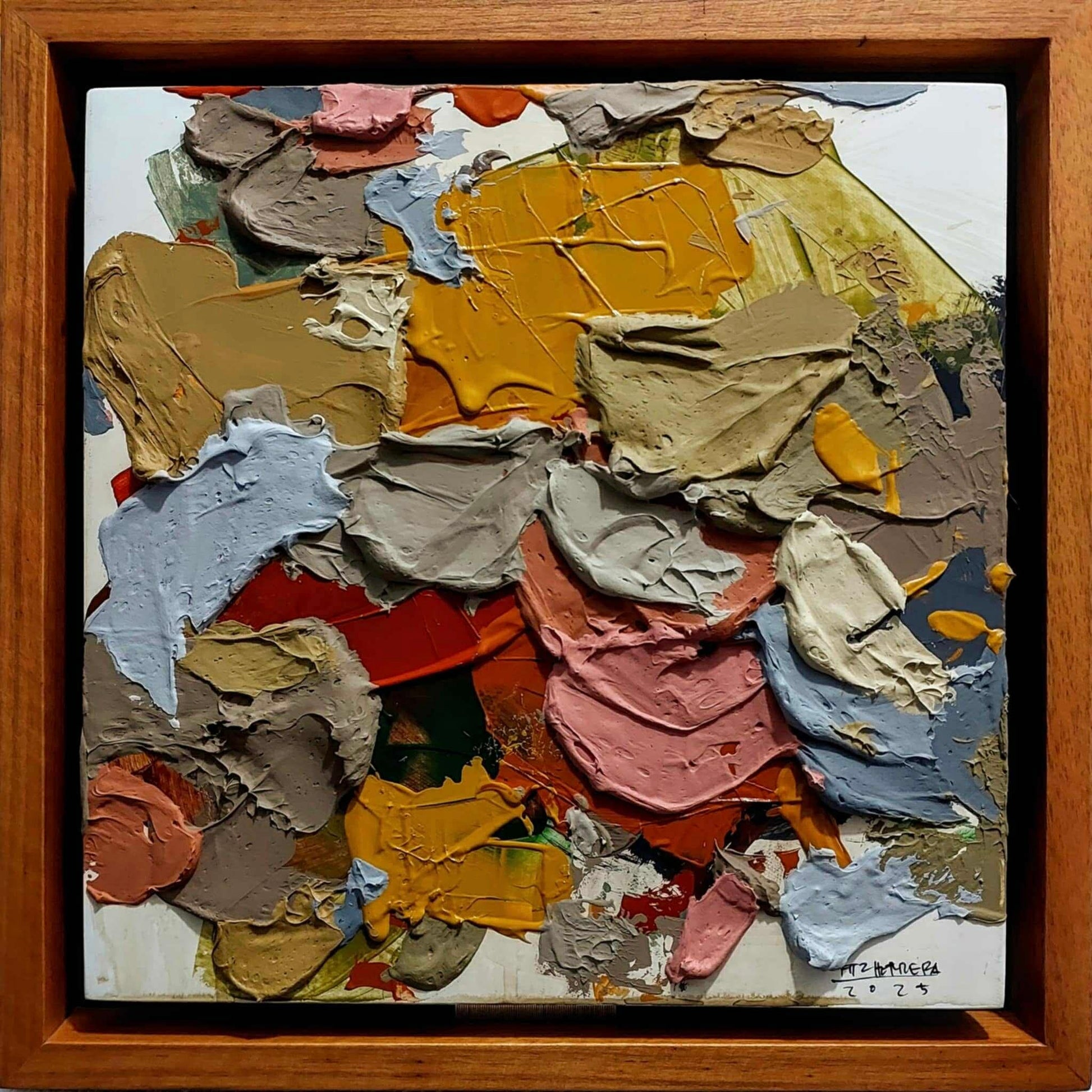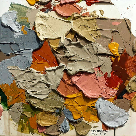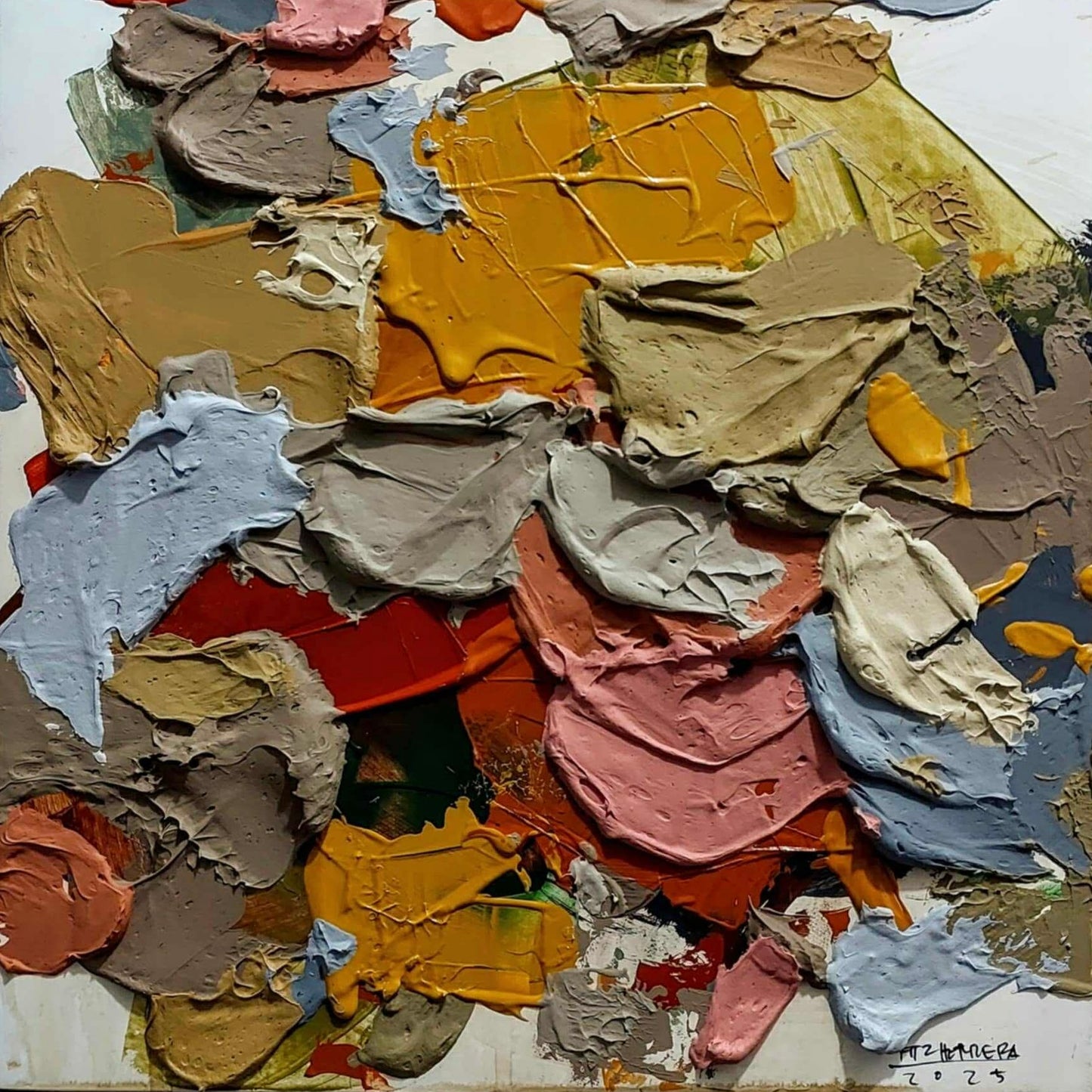 Herrera prefers to mix his own paint using modeling paste and pigment, which defines the textures and colors of his work. His abstract art evolved from minimal and restrained to lively and expressive, reflecting his personal experiences and emotions rather than societal influences.