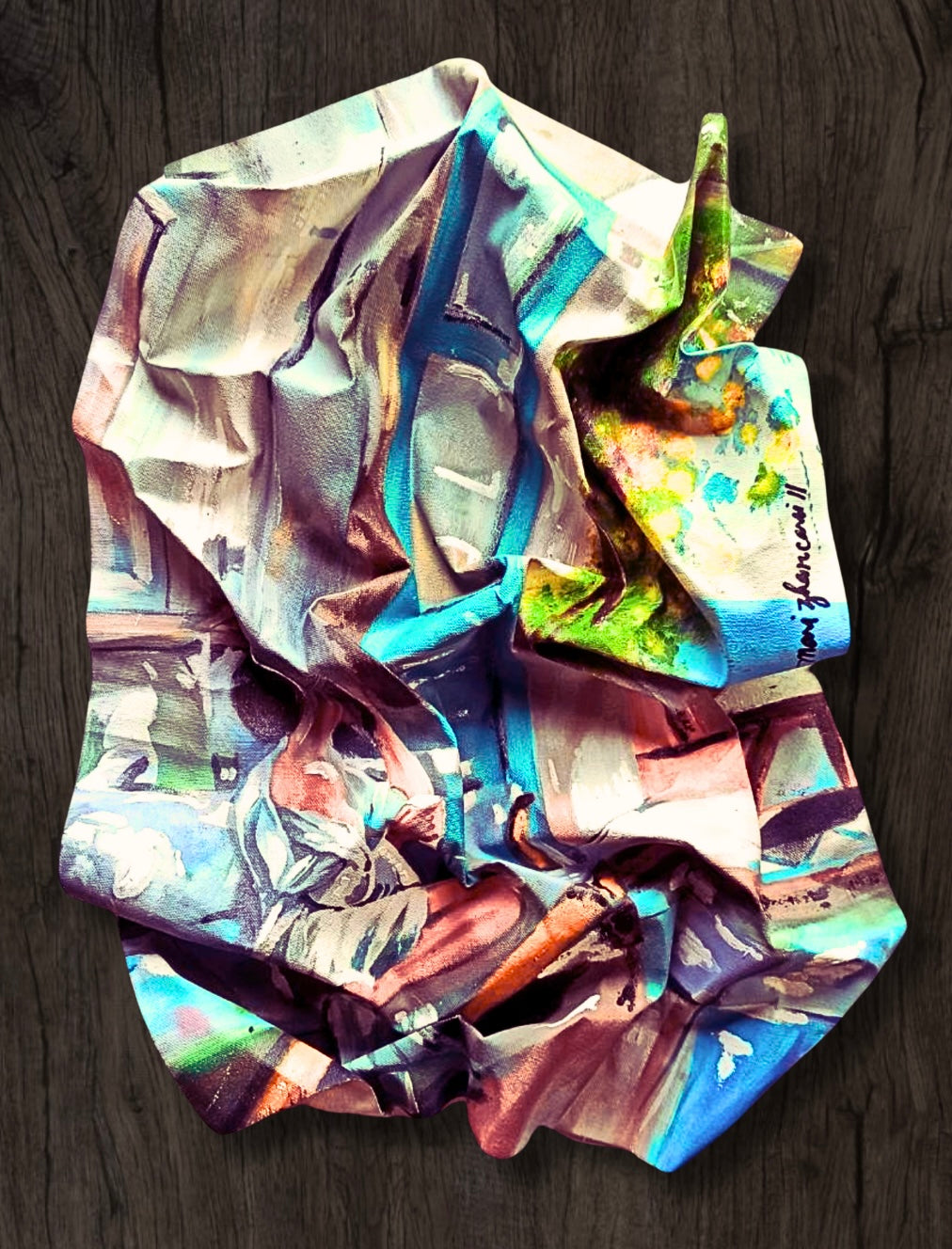 A meditation on stillness after the storm, What Remains, Remakes Her explores the quiet power of surrender. The sculptural canvas is not torn, but folded-each crease a marker of survival, each wrinkle holding memory, ache, and grace.