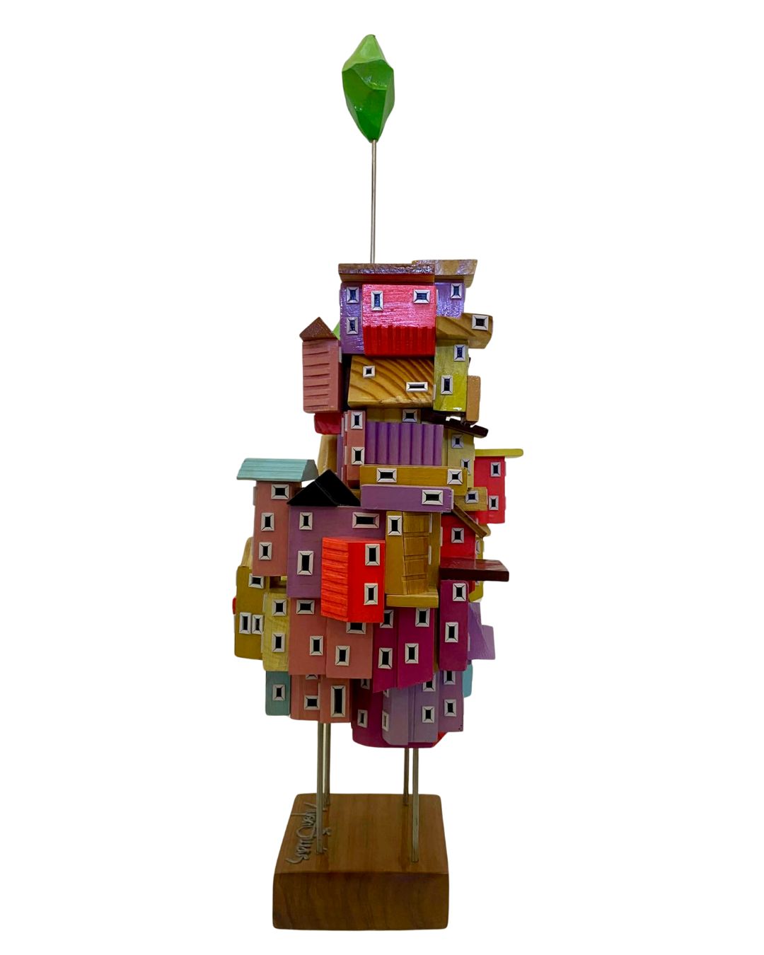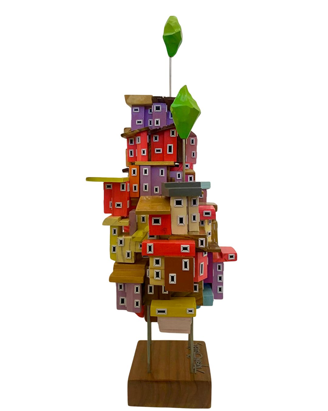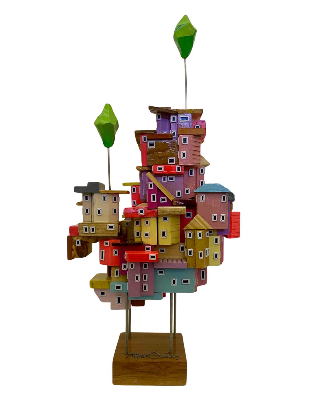 Aside from her artistic pursuits, Ayen Quias is the proprietor of Ayenics Arts and Crafts, a company specializing in crafting faux barrels and customized wood creations for weddings and other events. Unfortunately, the business, along with the entire event industry, suffered significant setbacks during the Covid-19 pandemic due to restrictions on social gatherings. Despite the challenges, Ayen Quias is an optimistic individual who views every mistake as an opportunity and possibility. In response to the pandemic's impact, she created "Ayen's Little Town," a captivating wood collage featuring colorful dense houses against candy-colored skies. This remarkable piece, made from wood scraps, serves as a poignant reminder of the lives lost during the pandemic, the ongoing struggles, and the enduring hope for a better tomorrow.