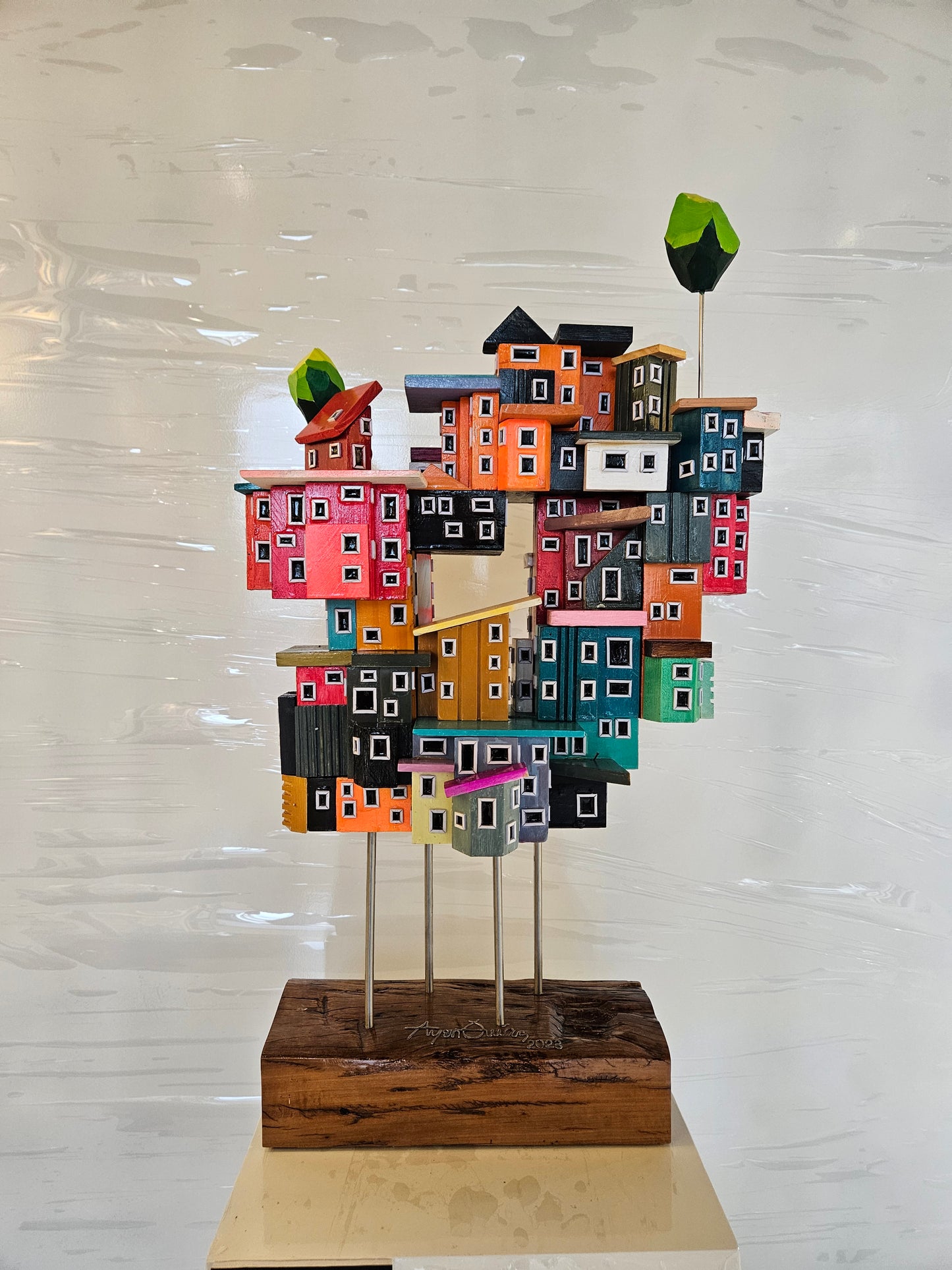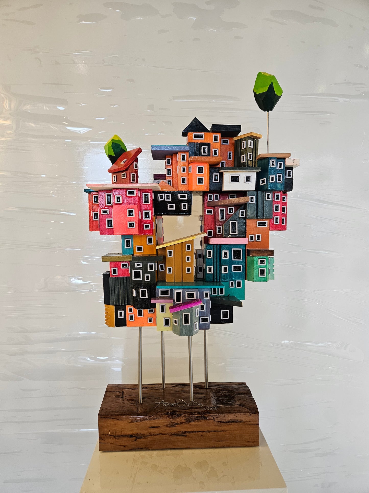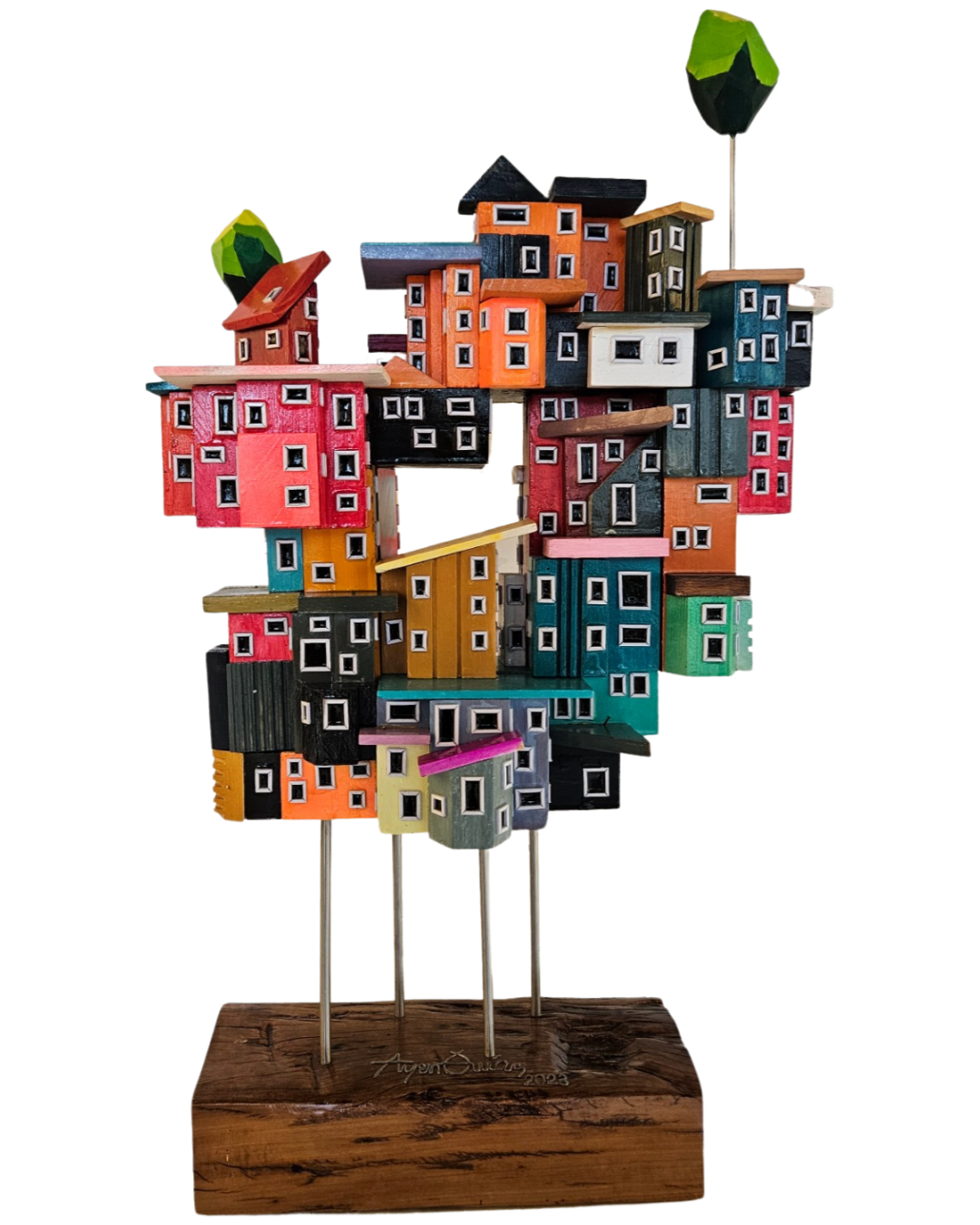 Aside from her artistic pursuits, Ayen Quias is the proprietor of Ayenics Arts and Crafts, a company specializing in crafting faux barrels and customized wood creations for weddings and other events. Unfortunately, the business, along with the entire event industry, suffered significant setbacks during the Covid-19 pandemic due to restrictions on social gatherings. Despite the challenges, Ayen Quias is an optimistic individual who views every mistake as an opportunity and possibility. In response to the pandemic's impact, she created "Ayen's Little Town," a captivating wood collage featuring colorful dense houses against candy-colored skies. This remarkable piece, made from wood scraps, serves as a poignant reminder of the lives lost during the pandemic, the ongoing struggles, and the enduring hope for a better tomorrow.