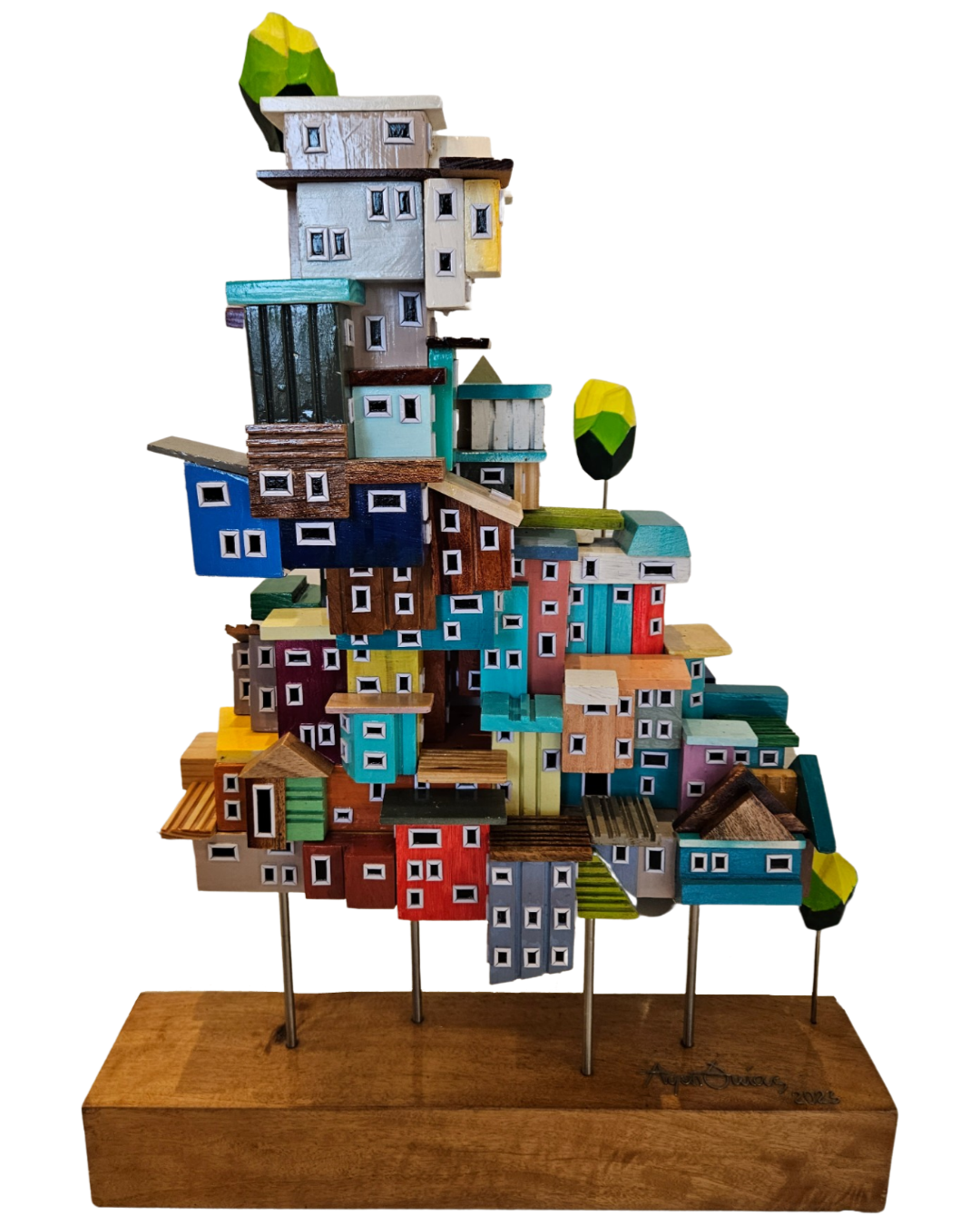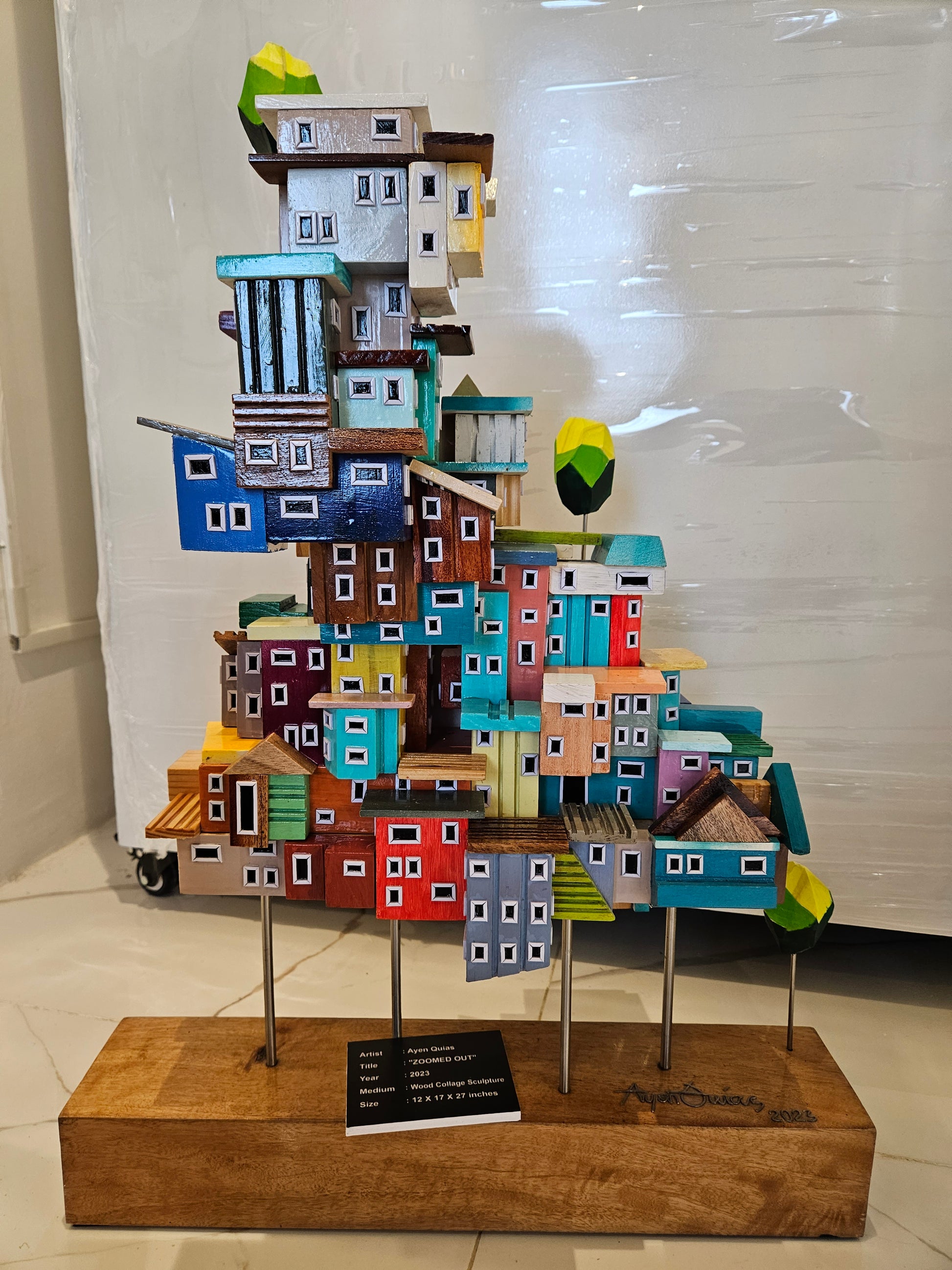 Aside from her artistic pursuits, Ayen Quias is the proprietor of Ayenics Arts and Crafts, a company specializing in crafting faux barrels and customized wood creations for weddings and other events. Unfortunately, the business, along with the entire event industry, suffered significant setbacks during the Covid-19 pandemic due to restrictions on social gatherings. Despite the challenges, Ayen Quias is an optimistic individual who views every mistake as an opportunity and possibility. In response to the pandemic's impact, she created "Ayen's Little Town," a captivating wood collage featuring colorful dense houses against candy-colored skies. This remarkable piece, made from wood scraps, serves as a poignant reminder of the lives lost during the pandemic, the ongoing struggles, and the enduring hope for a better tomorrow.